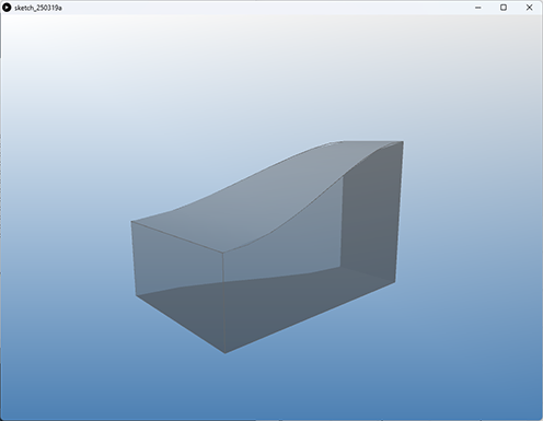 import processing.opengl.*; import igeo.*; void setup(){ size(960, 720, IG.GL); // control points IVec[][][] cpts = new IVec[4][3][2]; cpts[0][0][0] = new IVec(0,0,0); cpts[0][0][1] = new IVec(0,0,10); cpts[0][1][0] = new IVec(0,10,0); cpts[0][1][1] = new IVec(0,10,10); cpts[0][2][0] = new IVec(0,20,0); cpts[0][2][1] = new IVec(0,20,10); cpts[1][0][0] = new IVec(10,0,0); cpts[1][0][1] = new IVec(10,0,10); cpts[1][1][0] = new IVec(10,10,0); cpts[1][1][1] = new IVec(10,10,10); cpts[1][2][0] = new IVec(10,20,0); cpts[1][2][1] = new IVec(10,20,10); cpts[2][0][0] = new IVec(20,0,0); cpts[2][0][1] = new IVec(20,0,20); cpts[2][1][0] = new IVec(20,5,0); cpts[2][1][1] = new IVec(20,5,20); cpts[2][2][0] = new IVec(20,10,0); cpts[2][2][1] = new IVec(20,10,20); cpts[3][0][0] = new IVec(30,0,0); cpts[3][0][1] = new IVec(30,0,20); cpts[3][1][0] = new IVec(30,5,0); cpts[3][1][1] = new IVec(30,5,20); cpts[3][2][0] = new IVec(30,10,0); cpts[3][2][1] = new IVec(30,10,20); // creating NURBS IVolume IVolume vol = new IVolume(cpts, 3, 2, 1); int unum = 6; int vnum = 5; int wnum = 5; double uinc = 1.0/unum; double vinc = 1.0/vnum; double winc = 1.0/wnum; double radius = 0.4; for(int i=0; i <= unum; i++){ for(int j=0; j <= vnum; j++){ for(int k=0; k <= wnum; k++){ IVec pt111 = vol.pt(i*uinc, j*vinc, k*winc); IVec pt211 = vol.pt((i+1)*uinc, j*vinc, k*winc); IVec pt121 = vol.pt(i*uinc, (j+1)*vinc, k*winc); IVec pt221 = vol.pt((i+1)*uinc, (j+1)*vinc, k*winc); IVec pt112 = vol.pt(i*uinc, j*vinc, (k+1)*winc); IVec pt212 = vol.pt((i+1)*uinc, j*vinc, (k+1)*winc); IVec pt122 = vol.pt(i*uinc, (j+1)*vinc, (k+1)*winc); IVec pt222 = vol.pt((i+1)*uinc, (j+1)*vinc, (k+1)*winc); if(i < unum && j < vnum && k < wnum){ new IBox(pt111, pt211, pt221, pt121, pt112, pt212, pt222, pt122).clr(1.0,0.5,0); } } } } vol.hide(); }