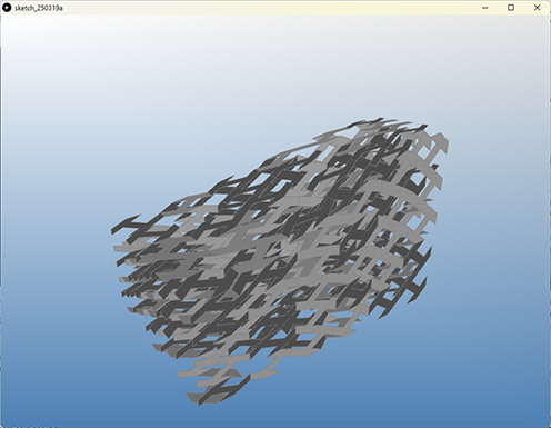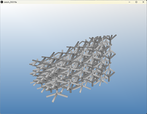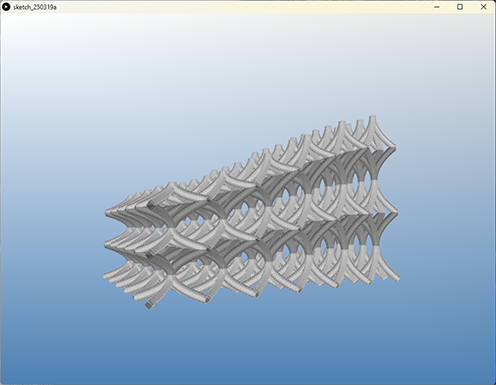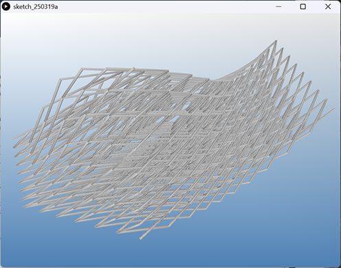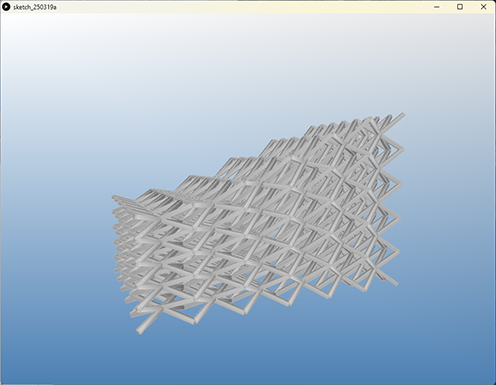import processing.opengl.*; import igeo.*; void setup(){ size(960, 720, IG.GL); // control points IVec[][][] cpts = new IVec[4][3][2]; cpts[0][0][0] = new IVec(0,0,0); cpts[0][0][1] = new IVec(0,0,10); cpts[0][1][0] = new IVec(0,10,0); cpts[0][1][1] = new IVec(0,10,10); cpts[0][2][0] = new IVec(0,20,0); cpts[0][2][1] = new IVec(0,20,10); cpts[1][0][0] = new IVec(10,0,0); cpts[1][0][1] = new IVec(10,0,10); cpts[1][1][0] = new IVec(10,10,0); cpts[1][1][1] = new IVec(10,10,10); cpts[1][2][0] = new IVec(10,20,0); cpts[1][2][1] = new IVec(10,20,10); cpts[2][0][0] = new IVec(20,0,0); cpts[2][0][1] = new IVec(20,0,20); cpts[2][1][0] = new IVec(20,5,0); cpts[2][1][1] = new IVec(20,5,20); cpts[2][2][0] = new IVec(20,10,0); cpts[2][2][1] = new IVec(20,10,20); cpts[3][0][0] = new IVec(30,0,0); cpts[3][0][1] = new IVec(30,0,20); cpts[3][1][0] = new IVec(30,5,0); cpts[3][1][1] = new IVec(30,5,20); cpts[3][2][0] = new IVec(30,10,0); cpts[3][2][1] = new IVec(30,10,20); // creating NURBS IVolume IVolume vol = new IVolume(cpts, 3, 2, 1); int unum = 6; int vnum = 5; int wnum = 7; double uinc = 1.0/unum; double vinc = 1.0/vnum; double winc = 1.0/wnum; double radius = 0.1; for(int i=0; i <= unum; i++){ for(int j=0; j <= vnum; j++){ for(int k=0; k <= wnum; k++){ double u = i*uinc; double v = j*vinc; double w = k*winc; if(j%2==1){ u += uinc/2; } if(k%3==1){ u+=uinc/2; v-=vinc/3; } else if(k%3==2){ u+=uinc/2; v+=vinc/3; } IVec uvw111 = new IVec(u,v,w); IVec uvw112 = new IVec(u-uinc/2, v-vinc/3, w+winc); IVec uvw212 = new IVec(u+uinc/2, v-vinc/3, w+winc); IVec uvw122 = new IVec(u, v+vinc*2/3, w+winc); if(uvw111.x>=0 && uvw111.x<=1 && uvw111.y>=0 && uvw111.y<=1){ if(uvw112.x>=0 && uvw112.x<=1 && uvw112.y>=0 && uvw112.y<=1){ IG.pipe(vol.pt(uvw111), vol.pt(uvw112),radius).clr(0.7,0.7,0.7); } if(uvw212.x>=0 && uvw212.x<=1 && uvw212.y>=0 && uvw212.y<=1){ IG.pipe(vol.pt(uvw111), vol.pt(uvw212),radius).clr(0.7,0.7,0.7); } if(uvw122.x>=0 && uvw122.x<=1 && uvw122.y>=0 && uvw122.y<=1){ IG.pipe(vol.pt(uvw111), vol.pt(uvw122),radius).clr(0.7,0.7,0.7); } } } } } vol.hide(); }