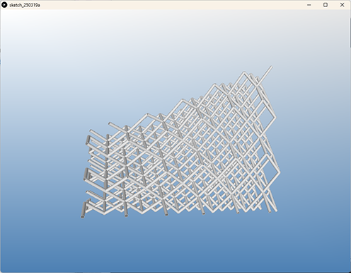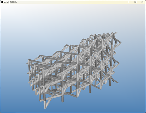 import processing.opengl.*; import igeo.*; void setup(){ size(960, 720, IG.GL); //importing a Rhino file, whose file version needs to be Rhino 4. >_< IG.open("surfs.3dm"); ISurface[] surfs = IG.surfaces(); ArrayList< ISurface > surfArray = new ArrayList< ISurface >(); for(int i=0; i < surfs.length; i++){ surfArray.add(surfs[i]); } //sorting surfaces in X by the approx center points ISort.sort(surfArray, new ISurfaceXComparator()); // ISort.sort(surfArray, new ISurfaceYComparator()); // ISort.sort(surfArray, new ISurfaceZComparator()); surfs = surfArray.toArray(surfs); //number of control points in U and V needs to be all same. int ucpNum = surfs[0].ucpNum(); int vcpNum = surfs[0].vcpNum(); int wcpNum = surfs.length; int udeg = surfs[0].udeg(); //U and V degree are set to be the same with the imported surface. int vdeg = surfs[0].vdeg(); int wdeg = 3; //W degree can be set as you wish. IVec[][][] cpts = new IVec[ucpNum][vcpNum][wcpNum]; for(int i=0; i < ucpNum; i++){ for(int j=0; j < vcpNum; j++){ for(int k=0; k < wcpNum; k++){ cpts[i][j][k] = surfs[k].cp(i,j); } } } IG.del(surfs); //delete the imported surfaces. IVolume vol = new IVolume(cpts, udeg, vdeg, wdeg).clr(1.0,1.0,0); int unum = 6; int vnum = 8; int wnum = 10; double uinc = 1.0/unum; double vinc = 1.0/vnum; double winc = 1.0/wnum; double radius = 0.1; for(int i=0; i <= unum; i++){ for(int j=0; j <= vnum; j++){ for(int k=0; k <= wnum; k++){ IVec pt111 = vol.pt(i*uinc, j*vinc, k*winc); IVec pt221 = vol.pt((i+1)*uinc, (j+1)*vinc, k*winc); IVec pt122 = vol.pt(i*uinc, (j+1)*vinc, (k+1)*winc); IVec pt212 = vol.pt((i+1)*uinc, j*vinc, (k+1)*winc); if(i < unum && j < vnum){ IG.meshSquareStick(pt111, pt221, radius).clr(0.7,0.7,0.7); } if(j < vnum && k < wnum){ IG.meshSquareStick(pt111, pt122, radius).clr(0.7,0.7,0.7); } if(k < wnum && i < unum){ IG.meshSquareStick(pt111, pt212, radius).clr(0.7,0.7,0.7); } } } } vol.hide(); }