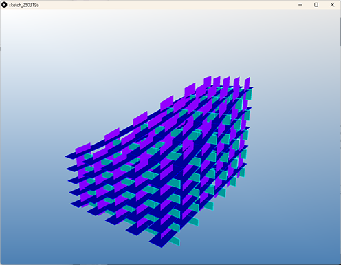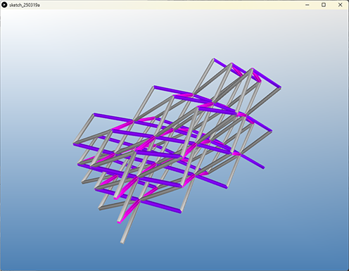 import processing.opengl.*; import igeo.*; void setup(){ size(960, 720, IG.GL); // control points IVec[][][] cpts = new IVec[4][3][2]; cpts[0][0][0] = new IVec(0,0,0); cpts[0][0][1] = new IVec(0,0,10); cpts[0][1][0] = new IVec(0,10,0); cpts[0][1][1] = new IVec(0,10,10); cpts[0][2][0] = new IVec(0,20,0); cpts[0][2][1] = new IVec(0,20,10); cpts[1][0][0] = new IVec(10,0,0); cpts[1][0][1] = new IVec(10,0,10); cpts[1][1][0] = new IVec(10,10,0); cpts[1][1][1] = new IVec(10,10,10); cpts[1][2][0] = new IVec(10,20,0); cpts[1][2][1] = new IVec(10,20,10); cpts[2][0][0] = new IVec(20,0,0); cpts[2][0][1] = new IVec(20,0,20); cpts[2][1][0] = new IVec(20,5,0); cpts[2][1][1] = new IVec(20,5,20); cpts[2][2][0] = new IVec(20,10,0); cpts[2][2][1] = new IVec(20,10,20); cpts[3][0][0] = new IVec(30,0,0); cpts[3][0][1] = new IVec(30,0,20); cpts[3][1][0] = new IVec(30,5,0); cpts[3][1][1] = new IVec(30,5,20); cpts[3][2][0] = new IVec(30,10,0); cpts[3][2][1] = new IVec(30,10,20); // creating NURBS IVolume IVolume vol = new IVolume(cpts, 3, 2, 1); int unum = 6; int vnum = 5; int wnum = 5; double uinc = 1.0/unum; double vinc = 1.0/vnum; double winc = 1.0/wnum; double radius = 0.4; for(int i=0; i <= unum; i++){ for(int j=0; j <= vnum; j++){ for(int k=0; k <= wnum; k++){ IVec pt111 = vol.pt(i*uinc, j*vinc, k*winc); IVec pt211 = vol.pt((i+1)*uinc, j*vinc, k*winc); IVec pt121 = vol.pt(i*uinc, (j+1)*vinc, k*winc); IVec pt221 = vol.pt((i+1)*uinc, (j+1)*vinc, k*winc); IVec pt112 = vol.pt(i*uinc, j*vinc, (k+1)*winc); IVec pt212 = vol.pt((i+1)*uinc, j*vinc, (k+1)*winc); IVec pt122 = vol.pt(i*uinc, (j+1)*vinc, (k+1)*winc); IVec pt222 = vol.pt((i+1)*uinc, (j+1)*vinc, (k+1)*winc); if(i < unum && j < vnum && k < wnum){ if(i%2==k%2 && j%2==k%2){ IG.meshSquareStick(pt111, pt222, radius).clr(0.7,0.7,0.7); } if(i%2==k%2 && j%2!=k%2){ IG.meshSquareStick(pt121, pt212, radius).clr(0.5,0.5,0.5); } if(i%2!=k%2 && j%2==k%2){ IG.meshSquareStick(pt211, pt122, radius).clr(0.5,0,1.0); } if(i%2!=k%2 && j%2!=k%2){ IG.meshSquareStick(pt112, pt221, radius).clr(1.0,0,1.0); } } } } } vol.hide(); }
