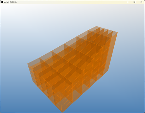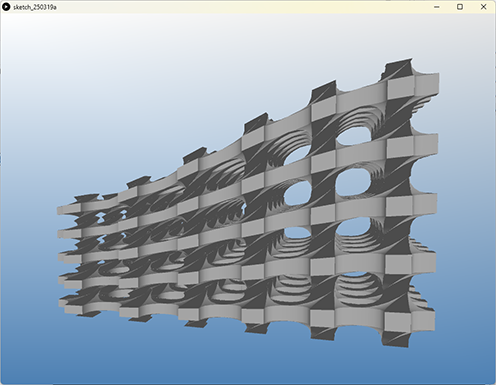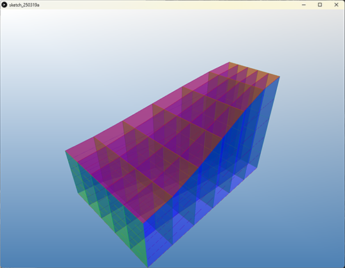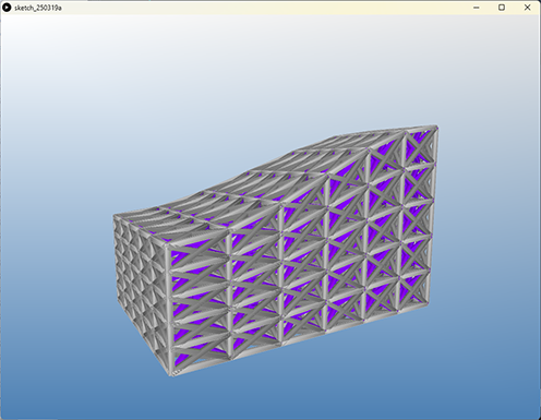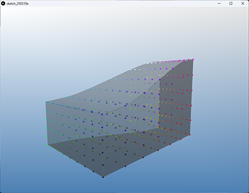 import processing.opengl.*; import igeo.*; void setup(){ size(960, 720, IG.GL); // control points IVec[][][] cpts = new IVec[4][3][2]; cpts[0][0][0] = new IVec(0,0,0); cpts[0][0][1] = new IVec(0,0,10); cpts[0][1][0] = new IVec(0,10,0); cpts[0][1][1] = new IVec(0,10,10); cpts[0][2][0] = new IVec(0,20,0); cpts[0][2][1] = new IVec(0,20,10); cpts[1][0][0] = new IVec(10,0,0); cpts[1][0][1] = new IVec(10,0,10); cpts[1][1][0] = new IVec(10,10,0); cpts[1][1][1] = new IVec(10,10,10); cpts[1][2][0] = new IVec(10,20,0); cpts[1][2][1] = new IVec(10,20,10); cpts[2][0][0] = new IVec(20,0,0); cpts[2][0][1] = new IVec(20,0,20); cpts[2][1][0] = new IVec(20,5,0); cpts[2][1][1] = new IVec(20,5,20); cpts[2][2][0] = new IVec(20,10,0); cpts[2][2][1] = new IVec(20,10,20); cpts[3][0][0] = new IVec(30,0,0); cpts[3][0][1] = new IVec(30,0,20); cpts[3][1][0] = new IVec(30,5,0); cpts[3][1][1] = new IVec(30,5,20); cpts[3][2][0] = new IVec(30,10,0); cpts[3][2][1] = new IVec(30,10,20); // creating NURBS IVolume IVolume vol = new IVolume(cpts, 3, 2, 1); int unum = 6; int vnum = 5; int wnum = 5; double uinc = 1.0/unum; double vinc = 1.0/vnum; double winc = 1.0/wnum; double radius = 0.4; for(int i=0; i <= unum; i++){ for(int j=0; j <= vnum; j++){ for(int k=0; k <= wnum; k++){ IVec pt111 = vol.pt(i*uinc, j*vinc, k*winc); IVec pt211 = vol.pt((i+1)*uinc, j*vinc, k*winc); IVec pt121 = vol.pt(i*uinc, (j+1)*vinc, k*winc); IVec pt221 = vol.pt((i+1)*uinc, (j+1)*vinc, k*winc); IVec pt112 = vol.pt(i*uinc, j*vinc, (k+1)*winc); IVec pt212 = vol.pt((i+1)*uinc, j*vinc, (k+1)*winc); IVec pt122 = vol.pt(i*uinc, (j+1)*vinc, (k+1)*winc); IVec pt222 = vol.pt((i+1)*uinc, (j+1)*vinc, (k+1)*winc); IVec mid1 = vol.pt((i+0.5)*uinc, (j+0.5)*vinc, k*winc); IVec mid2 = vol.pt((i+0.5)*uinc, (j+0.5)*vinc, (k+1)*winc); IVec center = vol.pt((i+0.5)*uinc, (j+0.5)*vinc, (k+0.5)*winc); if(i < unum && j < vnum && k < wnum){ if((i+j+k)%2 == 0){ IG.meshSquareStick(pt111, center, radius).clr(0.7,0.7,0.7); IG.meshSquareStick(pt211, center, radius).clr(0.7,0.7,0.7); IG.meshSquareStick(pt121, center, radius).clr(0.7,0.7,0.7); IG.meshSquareStick(pt221, center, radius).clr(0.7,0.7,0.7); IG.meshSquareStick(mid2, center, radius).clr(0.7,0.7,0.7); } else{ IG.meshSquareStick(mid1, center, radius).clr(0.5,0.5,0.5); IG.meshSquareStick(pt112, center, radius).clr(0.5,0.5,0.5); IG.meshSquareStick(pt212, center, radius).clr(0.5,0.5,0.5); IG.meshSquareStick(pt122, center, radius).clr(0.5,0.5,0.5); IG.meshSquareStick(pt222, center, radius).clr(0.5,0.5,0.5); } } } } } vol.hide(); }