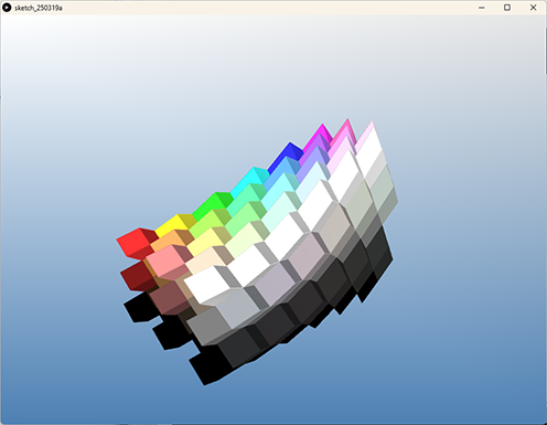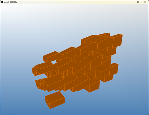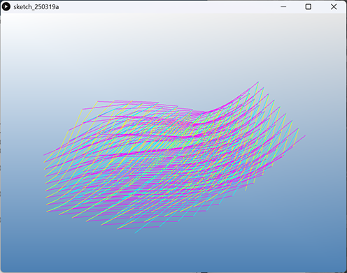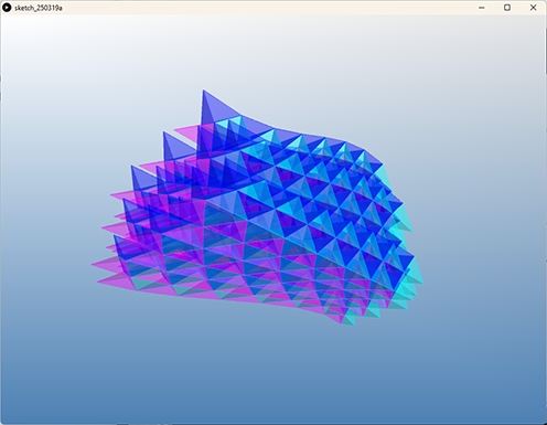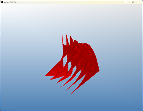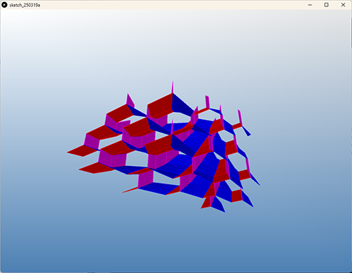 import processing.opengl.*; import igeo.*; void setup(){ size(960, 720, IG.GL); // control points IVec[][][] cpts = new IVec[4][3][2]; cpts[0][0][0] = new IVec(0,0,0); cpts[0][0][1] = new IVec(0,0,10); cpts[0][1][0] = new IVec(0,10,0); cpts[0][1][1] = new IVec(0,10,10); cpts[0][2][0] = new IVec(0,20,0); cpts[0][2][1] = new IVec(0,20,10); cpts[1][0][0] = new IVec(10,0,0); cpts[1][0][1] = new IVec(10,0,10); cpts[1][1][0] = new IVec(10,10,0); cpts[1][1][1] = new IVec(10,10,10); cpts[1][2][0] = new IVec(10,20,0); cpts[1][2][1] = new IVec(10,20,10); cpts[2][0][0] = new IVec(20,0,0); cpts[2][0][1] = new IVec(20,0,20); cpts[2][1][0] = new IVec(20,5,0); cpts[2][1][1] = new IVec(20,5,20); cpts[2][2][0] = new IVec(20,10,0); cpts[2][2][1] = new IVec(20,10,20); cpts[3][0][0] = new IVec(30,0,0); cpts[3][0][1] = new IVec(30,0,20); cpts[3][1][0] = new IVec(30,5,0); cpts[3][1][1] = new IVec(30,5,20); cpts[3][2][0] = new IVec(30,10,0); cpts[3][2][1] = new IVec(30,10,20); // creating NURBS IVolume IVolume vol = new IVolume(cpts, 3, 2, 1); int unum = 6; int vnum = 5; int wnum = 7; double uinc = 1.0/unum; double vinc = 1.0/vnum; double winc = 1.0/wnum; for(int i=0; i <= unum; i++){ for(int j=0; j <= vnum; j++){ for(int k=0; k <= wnum; k++){ double u = i*uinc; double v = j*vinc; double w = k*winc; if(i < unum && j < vnum && k < wnum){ if(j%2==1){ u += uinc/2; } if(k%3==1){ u+=uinc/2; v-=vinc/3; } else if(k%3==2){ u+=uinc/2; v+=vinc/3; } IVec uvw111 = new IVec(u,v,w); IVec uvw112 = new IVec(u-uinc/2, v-vinc/3, w+winc); IVec uvw212 = new IVec(u+uinc/2, v-vinc/3, w+winc); IVec uvw122 = new IVec(u, v+vinc*2/3, w+winc); IVec uvw113 = new IVec(u, v-vinc*2/3, w+winc*2); IVec uvw123 = new IVec(u-uinc/2, v+vinc/3, w+winc*2); IVec uvw223 = new IVec(u+uinc/2, v+vinc/3, w+winc*2); IVec uvw114 = new IVec(u, v, w+winc*3); new IBox(vol.pt(uvw111), vol.pt(uvw212), vol.pt(uvw113), vol.pt(uvw112), vol.pt(uvw122), vol.pt(uvw223), vol.pt(uvw114),vol.pt(uvw123)).hsb(u, v, w); } } } } vol.hide(); }