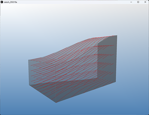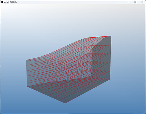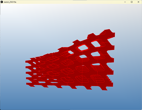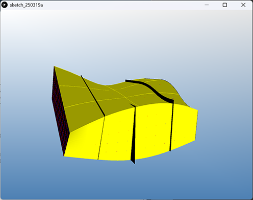 import processing.opengl.*; import igeo.*; void setup(){ size(960, 720, IG.GL); //importing a Rhino file, whose file version needs to be Rhino 4. >_< IG.open("surfs.3dm"); ISurface[] surfs = IG.surfaces(); ArrayList< ISurface > surfArray = new ArrayList< ISurface >(); for(int i=0; i < surfs.length; i++){ surfArray.add(surfs[i]); } //sorting surfaces in X by the approx center points ISort.sort(surfArray, new ISurfaceXComparator()); // ISort.sort(surfArray, new ISurfaceYComparator()); // ISort.sort(surfArray, new ISurfaceZComparator()); surfs = surfArray.toArray(surfs); //number of control points in U and V needs to be all same. int ucpNum = surfs[0].ucpNum(); int vcpNum = surfs[0].vcpNum(); int wcpNum = surfs.length; int udeg = surfs[0].udeg(); //U and V degree are set to be the same with the imported surface. int vdeg = surfs[0].vdeg(); int wdeg = 3; //W degree can be set as you wish. IVec[][][] cpts = new IVec[ucpNum][vcpNum][wcpNum]; for(int i=0; i < ucpNum; i++){ for(int j=0; j < vcpNum; j++){ for(int k=0; k < wcpNum; k++){ cpts[i][j][k] = surfs[k].cp(i,j); } } } IG.del(surfs); //delete the imported surfaces. IVolume vol = new IVolume(cpts, udeg, vdeg, wdeg).clr(1.0,1.0,0); int unum = 6; int vnum = 5; int wnum = 5; double uinc = 1.0/unum; double vinc = 1.0/vnum; double winc = 1.0/wnum; for(int i=0; i <= unum; i++){ for(int j=0; j <= vnum; j++){ for(int k=0; k <= wnum; k++){ IVec pt111 = vol.pt(i*uinc, j*vinc, k*winc); IVec pt211 = vol.pt((i+1)*uinc, j*vinc, k*winc); IVec pt121 = vol.pt(i*uinc, (j+1)*vinc, k*winc); IVec pt221 = vol.pt((i+1)*uinc, (j+1)*vinc, k*winc); IVec pt112 = vol.pt(i*uinc, j*vinc, (k+1)*winc); IVec pt212 = vol.pt((i+1)*uinc, j*vinc, (k+1)*winc); IVec pt122 = vol.pt(i*uinc, (j+1)*vinc, (k+1)*winc); IVec pt222 = vol.pt((i+1)*uinc, (j+1)*vinc, (k+1)*winc); if(i < unum && k < wnum ){ new ISurface(pt111,pt121,pt122,pt112).clr(1.0,0,0); } } } } vol.hide(); }