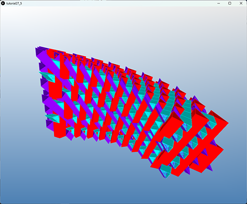 import processing.opengl.*; import igeo.*; void setup(){ size(960, 720, IG.GL); // control points int rnum = 10; IVec[][][] cpts3 = new IVec[rnum+1][2][2]; for(int i=0; i<=rnum; i++){ cpts3[i][0][0] = new IVec(10,0,0).rot(i*PI/rnum/2); cpts3[i][1][0] = new IVec(15,0,0).rot(i*PI/rnum/2); cpts3[i][0][1] = new IVec(10,0,5+i*0.5).rot(i*PI/rnum/2); cpts3[i][1][1] = new IVec(15,0,5+i*0.5).rot(i*PI/rnum/2); } // creating NURBS IVolume IVolume vol = new IVolume(cpts3, 2, 1, 1); int unum = 18; int vnum = 9; int wnum = 12; double uinc = 1.0/unum; double vinc = 1.0/vnum; double winc = 1.0/wnum; IVec wdir = new IVec(0,vinc*2/3,winc).mul(2); IVec wstart = new IVec(uinc, 0, 0).mul(-unum); for(int k=0; k < wnum; k++, wstart.add(wdir)){ IVec ustart = wstart.cp(); IVec udir = new IVec(uinc,0,0).mul(2); for(int i=0; i <= unum*2; i++, ustart.add(udir)){ IVec uvwdir = new IVec(uinc/2, vinc, 0); IVec uvw = ustart.cp().add(uvwdir, -unum); for(int j=0; j <= vnum*2; j++, uvw.add(uvwdir)){ double u = uvw.x; double v = uvw.y; double w = uvw.z; if(u >= 0 && v >= 0 && w >= 0 && u <= 1 && v <= 1 && w <= 1){ IVec uvw111 = new IVec(u,v,w); IVec uvw212 = new IVec(u+uinc/2, v-vinc/3, w+winc); IVec uvw122 = new IVec(u, v+vinc*2/3, w+winc); IVec uvw221 = new IVec(u+uinc/2, v+vinc, w); IVec uvw222 = new IVec(u+uinc, v+vinc*2/3, w+winc); IVec uvw232 = new IVec(u+uinc/2, v+vinc*5/3, w+winc); triangularPrism(vol, uvw212, uvw111, uvw122, uvw222, uvw221, uvw232).clr(0,1.0,1.0); } } } } IVec udir = new IVec(uinc, 0, 0).mul(2); IVec ustart = new IVec(0,0,0).add(udir, -unum); for(int i=0; i <= unum*2; i++, ustart.add(udir)){ IVec vdir = new IVec(-uinc/2, vinc, 0).mul(2); IVec vstart = ustart.cp(); for(int j=i%2; j <= vnum; j++, vstart.add(vdir)){ IVec uvw = vstart.cp(); IVec uvwinc = new IVec(uinc/2, -vinc/3, winc); for(int k=0; k < wnum; k++){ double u = uvw.x; double v = uvw.y; double w = uvw.z; if(u >= 0 && v >= 0 && w >= 0 && u <= 1 && v <= 1 && w <= 1){ IVec uvw111 = new IVec(u,v,w); IVec uvw212 = new IVec(u+uinc/2, v-vinc/3, w+winc); IVec uvw211 = new IVec(u+uinc, v, w); IVec uvw221 = new IVec(u+uinc/2, v+vinc, w); IVec uvw222 = new IVec(u+uinc, v+vinc*2/3, w+winc); IVec uvw210 = new IVec(u+uinc/2, v+vinc/3, w-winc); triangularPrism(vol, uvw111, uvw221, uvw210, uvw212, uvw222, uvw211).clr(0.5,0,1.); } uvw.add(uvwinc); } } } IVec udir2 = new IVec(uinc, 0, 0).mul(2); IVec ustart2 = new IVec(0,0,0).add(udir2, -unum).add(udir, 0.5); for(int i=0; i <= unum*2; i++, ustart2.add(udir2)){ IVec vdir = new IVec(-uinc/2, vinc, 0).mul(2); IVec vstart = ustart2.cp().add(vdir, -vnum); for(int j=i%2; j <= vnum*2; j++, vstart.add(vdir)){ IVec uvw = vstart.cp(); IVec uvwinc = new IVec(0, vinc*2/3, winc); for(int k=0; k < wnum; k++, uvw.add(uvwinc)){ double u = uvw.x; double v = uvw.y; double w = uvw.z; if(u >= 0 && v >= 0 && w >= 0 && u <= 1 && v <= 1 && w <= 1){ IVec uvw101 = new IVec(u+uinc/2,v-vinc,w); IVec uvw111 = new IVec(u,v,w); IVec uvw212 = new IVec(u+uinc/2, v-vinc/3, w+winc); IVec uvw122 = new IVec(u, v+vinc*2/3, w+winc); IVec uvw211 = new IVec(u+uinc, v, w); IVec uvw222 = new IVec(u+uinc, v+vinc*2/3, w+winc); triangularPrism(vol, uvw111, uvw211, uvw101, uvw122, uvw222, uvw212).clr(1.0,0,0); } } } } vol.hide(); } ISurface triangularPrism(IVolume vol, IVec uvw11, IVec uvw12, IVec uvw13, IVec uvw21, IVec uvw22, IVec uvw23){ IVec[][] cpts = new IVec[3][2]; cpts[0][0] = vol.pt(uvw11); cpts[1][0] = vol.pt(uvw12); cpts[2][0] = vol.pt(uvw13); cpts[0][1] = vol.pt(uvw21); cpts[1][1] = vol.pt(uvw22); cpts[2][1] = vol.pt(uvw23); return new ISurface(cpts, true, false); }