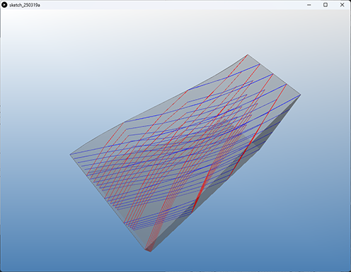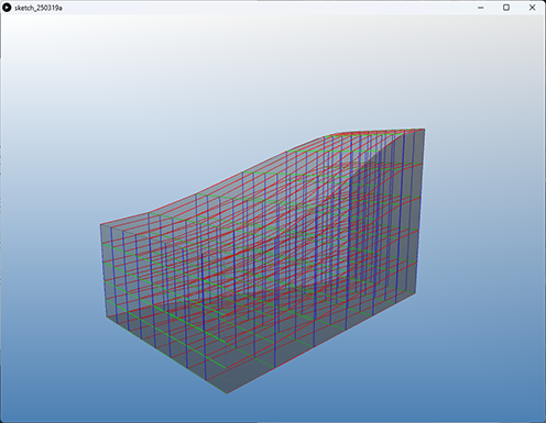 import processing.opengl.*; import igeo.*; void setup(){ size(960, 720, IG.GL); //importing a Rhino file, whose file version needs to be Rhino 4. >_< IG.open("surfs.3dm"); ISurface[] surfs = IG.surfaces(); ArrayList< ISurface > surfArray = new ArrayList< ISurface >(); for(int i=0; i < surfs.length; i++){ surfArray.add(surfs[i]); } //sorting surfaces in X by the approx center points ISort.sort(surfArray, new ISurfaceXComparator()); // ISort.sort(surfArray, new ISurfaceYComparator()); // ISort.sort(surfArray, new ISurfaceZComparator()); surfs = surfArray.toArray(surfs); //number of control points in U and V needs to be all same. int ucpNum = surfs[0].ucpNum(); int vcpNum = surfs[0].vcpNum(); int wcpNum = surfs.length; //U and V degree are set to be the same with the imported surface. int udeg = surfs[0].udeg(); int vdeg = surfs[0].vdeg(); //W degree can be set as you wish. int wdeg = 3; IVec[][][] cpts = new IVec[ucpNum][vcpNum][wcpNum]; for(int i=0; i < ucpNum; i++){ for(int j=0; j < vcpNum; j++){ for(int k=0; k < wcpNum; k++){ cpts[i][j][k] = surfs[k].cp(i,j); } } } //delete the imported surfaces. //IG.del(surfs); IVolume vol = new IVolume(cpts, udeg, vdeg, wdeg).clr(1.0,1.0,0); int unum = 8; int vnum = 10; int wnum = 12; double uinc = 1.0/unum; double vinc = 1.0/vnum; double winc = 1.0/wnum; for(int i=0; i <= unum; i++){ for(int j=0; j <= vnum; j++){ for(int k=0; k <= wnum; k++){ IVec pt111 = vol.pt(i*uinc, j*vinc, k*winc); IVec pt211 = vol.pt((i+1)*uinc, j*vinc, k*winc); IVec pt121 = vol.pt(i*uinc, (j+1)*vinc, k*winc); IVec pt221 = vol.pt((i+1)*uinc, (j+1)*vinc, k*winc); if(i < unum && j < vnum){ if((i+j)%2==0){ // UV diagonal line new ICurve(pt111, pt221).clr(1.0,0,0); } else{ // UV line in another diagonal direction new ICurve(pt211, pt121).clr(0,0,1.0); } } } } } }