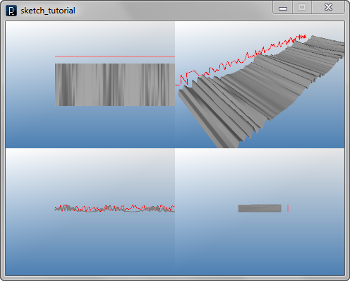 add_library('igeo') size( 480, 360, IG.GL ) num = 100 cpts1 = [] for i in range(num) : cpts1.append( IVec(i*2-50, 40, IRand.get()*10) ) ICurve(cpts1).clr(1.,0,0) cpts2 = [] for i in range(num) : cpts2.append([]) cpts2[i].append(IVec(i*2-50,-30, IRand.get()*5*(sin(i*0.2)+1) )) cpts2[i].append(IVec(i*2-50, 30, IRand.get()*5*(sin(i*0.2)+1) )) ISurface(cpts2)