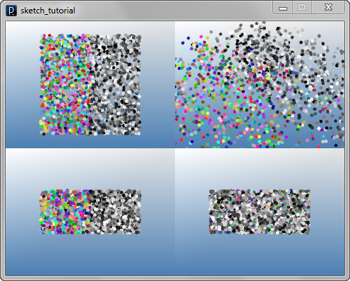add_library('igeo') size( 480, 360, IG.GL ) for i in range(1000) : IPoint(IRand.pt(-70,-70,-30,0,70,30)).clr(IRand.clr()) IPoint(IRand.pt(0,-70,-30,70,70,30)).clr(IRand.gray())