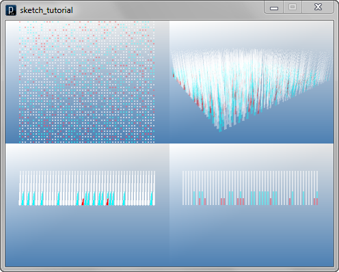 add_library('igeo') size( 480, 360, IG.GL ) for i in range(50) : for j in range(50) : x = i*4-100 y = j*4-100 # 50% probability to be executed if IRand.pct(50) : ISurface(x,y,0,x+2,y,0,x+2,y,50).clr(1.,1.,1.) # 50% of the rest ( = 25%) elif IRand.pct(50) : ISurface(x,y,0,x+2,y,0,x+2,y,20).clr(0,1.,1.) # 50% of the rest of the rest ( = 12.5%) elif IRand.pct(50) : ISurface(x,y,0,x+2,y,0,x+2,y,10).clr(1.,0,0)