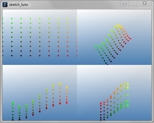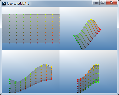 import processing.opengl.*; import igeo.*; size( 480, 360, IG.GL ); //IG.open("surface1.3dm"); //input geometry from 3dm file IG.open("surface1.obj"); ///input geometry from OBJ file ISurface[] surfs = IG.surfaces(); for( ISurface surf : surfs ){ int unum = 8, vnum = 8; double uinc = 1.0/unum, vinc = 1.0/vnum; for(int i=0; i <= unum; i++){ for(int j=0; j <= vnum; j++){ IVec pt = surf.pt( i*uinc, j*vinc ); new IPoint(pt).clr( i*uinc, j*vinc, 0); } } surf.del(); }
