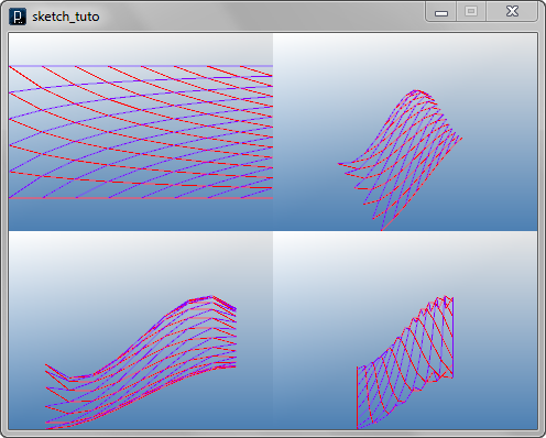 import processing.opengl.*; import igeo.*; size( 480, 360, IG.GL ); //IG.open("surface1.3dm"); //input geometry from 3dm file IG.open("surface1.obj"); ///input geometry from OBJ file ISurface[] surfs = IG.surfaces(); for( ISurface surf : surfs ){ int unum = 8, vnum = 4; double uinc = 1.0/unum, vinc = 1.0/vnum; for(int i=0; i < unum; i++){ vnum++; vinc = 1.0/vnum; for(int j=0; j <= vnum; j++){ double vinc2 = 1.0/(vnum+1); IVec pt1 = surf.pt(i*uinc, j*vinc); IVec pt2 = surf.pt((i+1)*uinc, j*vinc2); IVec pt3 = surf.pt((i+1)*uinc, (j+1)*vinc2); new ICurve(pt1, pt2).clr(1.,0,0); new ICurve(pt1, pt3).clr(.5,0,1); } } surf.del(); }