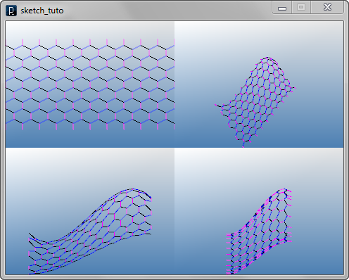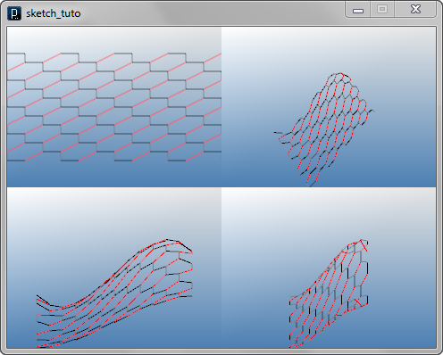 import processing.opengl.*; import igeo.*; size( 480, 360, IG.GL ); //IG.open("surface1.3dm"); //input geometry from 3dm file IG.open("surface1.obj"); ///input geometry from OBJ file ISurface[] surfs = IG.surfaces(); for( ISurface surf : surfs ){ int unum = 20, vnum = 8; double uinc = 1.0/unum, vinc = 1.0/vnum; double r = 0.3; for(int i=0; i <= unum; i++){ for(int j=0; j <= vnum; j++){ if( (i+j)%2 == 0 ){ IVec pt1 = surf.pt(i*uinc, (j-r)*vinc); IVec pt2 = surf.pt(i*uinc, (j+r)*vinc); new ICurve(pt1, pt2).clr(1.,0,1.); if( i < unum ){ if( j > 0){ IVec pt3 = surf.pt((i+1)*uinc, (j-1+r)*vinc); new ICurve(pt1, pt3).clr(0); } if( j < vnum ){ IVec pt4 = surf.pt((i+1)*uinc, (j+1-r)*vinc); new ICurve(pt2, pt4).clr(0,0,1.); } } } } } surf.del(); }