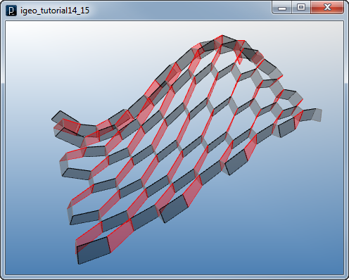 import processing.opengl.*; import igeo.*; size( 480, 360, IG.GL ); //IG.open("surface1.3dm"); //input geometry from 3dm file IG.open("surface1.obj"); ///input geometry from OBJ file ISurface[] surfs = IG.surfaces(); for( ISurface surf : surfs ){ int unum = 8, vnum = 8; double uinc = 1.0/unum, vinc = 1.0/vnum; for(int i=0; i < unum; i++){ for(int j=0; j <= vnum; j++){ if( (i+j)%2 == 0 ){ IVec pt1 = surf.pt(i*uinc, j*vinc); if( j > 0){ IVec pt2 = surf.pt((i+1)*uinc, (j-1)*vinc); new ICurve(pt1, pt2).clr(0); } if( j < vnum ){ IVec pt3 = surf.pt((i+1)*uinc, (j+1)*vinc); new ICurve(pt1, pt3).clr(0,0,1.); } } } } surf.del(); }