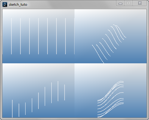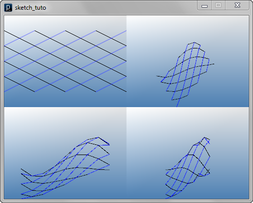 import processing.opengl.*; import igeo.*; size( 480, 360, IG.GL ); //IG.open("surface1.3dm"); //input geometry from 3dm file IG.open("surface1.obj"); ///input geometry from OBJ file ISurface[] surfs = IG.surfaces(); for( ISurface surf : surfs ){ int unum = 8, vnum = 8; double uinc = 1.0/unum, vinc = 1.0/vnum; for(int i=0; i < unum; i++){ for(int j=0; j < vnum; j++){ IVec pt1 = surf.pt(i*uinc, (j+1)*vinc); IVec pt2 = surf.pt((i+1)*uinc, j*vinc); new ICurve(pt1, pt2).clr(0,0,1.); } } surf.del(); }