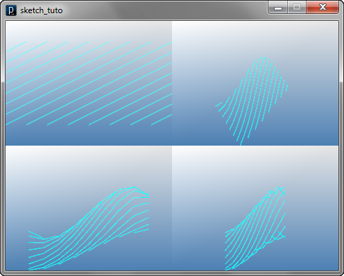 import processing.opengl.*; import igeo.*; size( 480, 360, IG.GL ); //IG.open("surface1.3dm"); //input geometry from 3dm file IG.open("surface1.obj"); ///input geometry from OBJ file ISurface[] surfs = IG.surfaces(); for( ISurface surf : surfs ){ int unum = 8, vnum = 8; double uinc = 1.0/unum, vinc = 1.0/vnum; for(int i=0; i < unum; i++){ for(int j=0; j < vnum; j++){ IVec pt1 = surf.pt(i*uinc, j*vinc); IVec pt2 = surf.pt((i+1)*uinc, (j+1)*vinc); new ICurve(pt1, pt2).clr(0,1.,1.); } } surf.del(); }