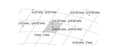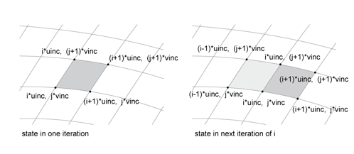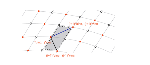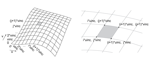 When you run the for loops with the counter i and j, the behavior of the internal parameter of u and v, calculated by the counter i, j and the interval uinc, vinc on the surface can be diagrammed like the below.