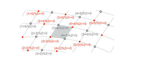 The if condition of if( (i+j)%2 == 0 ) picks every other point in the diagonal checker pattern way as shown in the diagram below.