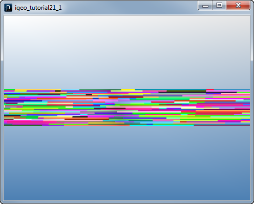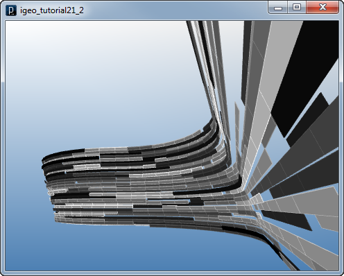 add_library('igeo') size(480, 360, IG.GL) IG.open("surface5.3dm") surfaces = IG.surfaces() for surf in surfaces : unum = 30 vnum = 40 uinc = 1.0/unum vinc = 1.0/vnum for i in range(unum) : for j in range(vnum) : vlen = IRand.getInt(1, 10) if j+vlen > vnum : vlen = vnum-j cpts = [] cpts.append([]) cpts.append([]) for k in range(vlen+1) : cpts[0].append(surf.pt(i*uinc, (j + k)*vinc)) cpts[1].append(surf.pt((i+1)*uinc, (j + k)*vinc)) ISurface(cpts).clr(IRand.clr()) j += vlen-1 surf.del()