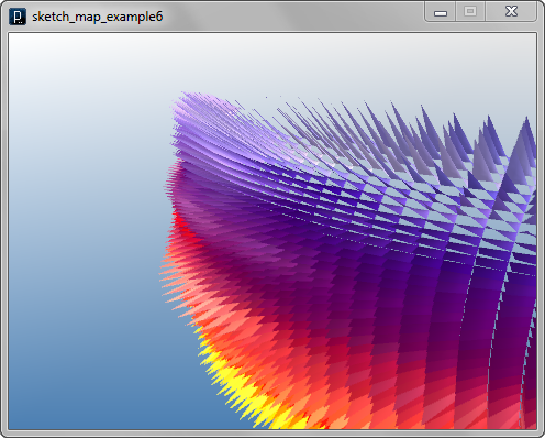 add_library('igeo') size(480, 360, IG.GL) IG.open("surface7.3dm") surfaces = IG.surfaces() map = IImageMap("map1.jpg") for surf in surfaces : unum = 20 vnum = 20 uinc = 1.0/unum vinc = 1.0/vnum for i in range(unum) : for j in range(vnum) : val = map.get( i*uinc, j*vinc ) pt11 = surf.pt( i*uinc, j*vinc ) pt21 = surf.pt( (i+1)*uinc, j*vinc ) pt12 = surf.pt( i*uinc, (j + val)*vinc ) pt22 = surf.pt( (i+1)*uinc, (j + val)*vinc ) ISurface(pt11, pt12, pt22, pt21).clr(.3) surf.del()