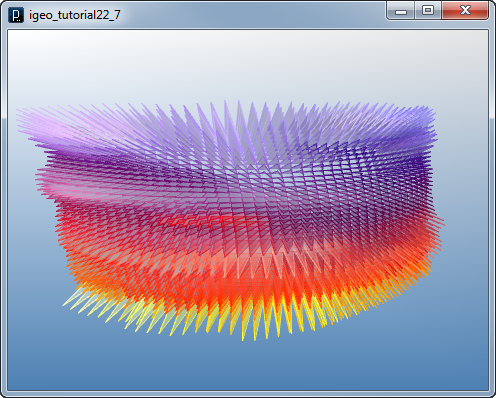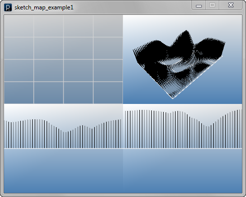add_library('igeo') size(480, 360, IG.GL) IG.open("surface6.3dm") surfaces = IG.surfaces() map = IImageMap("map1.jpg") for surf in surfaces : unum = 50 vnum = 50 uinc = 1.0/unum vinc = 1.0/vnum for i in range(unum) : for j in range(vnum) : val = map.get( i*uinc, j*vinc ) pt1 = surf.pt( i*uinc, j*vinc ) pt2 = surf.pt( i*uinc, j*vinc, val*-10 ) ICurve(pt1, pt2).clr(0)