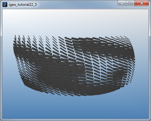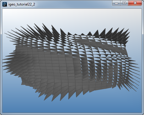 add_library('igeo') size(480, 360, IG.GL) IG.open("surface7.3dm") surfaces = IG.surfaces() map = IImageMap("map1.jpg") for surf in surfaces : unum = 20 vnum = 20 uinc = 1.0/unum vinc = 1.0/vnum for i in range(unum) : for j in range(vnum) : val = map.get( i*uinc, j*vinc ) pt11 = surf.pt( i*uinc, j*vinc ) pt21 = surf.pt( (i + 1)*uinc, j*vinc ) pt12 = surf.pt( i*uinc, (j + (1-val) )*vinc ) pt22 = surf.pt( (i + 1)*uinc, (j + (1-val) )*vinc ) panel = ISurface(pt11, pt12, pt22, pt21).clr(.2) center = surf.pt( (i+0.5)*uinc, (j+0.5)*vinc ) normal = surf.nml( (i+0.5)*uinc, (j+0.5)*vinc ) panel.rot(center, normal, val*PI/4 ) surf.del()