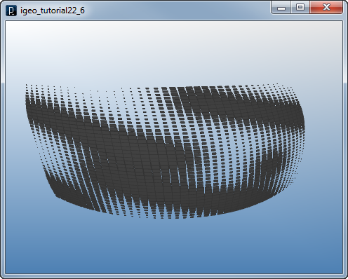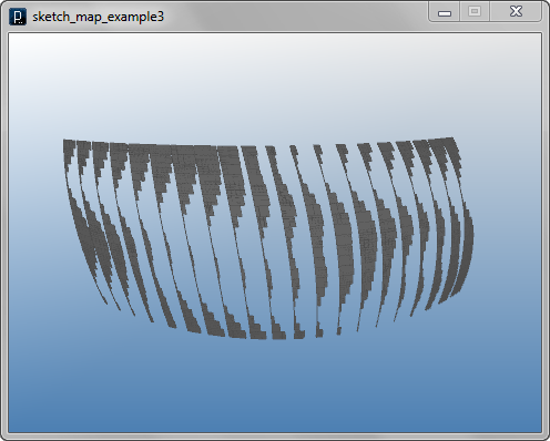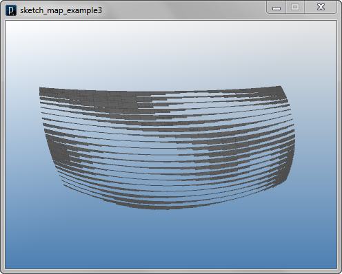 add_library('igeo') size(480, 360, IG.GL) IG.open("surface7.3dm") surfaces = IG.surfaces() map = IImageMap("map1.jpg") for surf in surfaces : unum = 20 vnum = 20 uinc = 1.0/unum vinc = 1.0/vnum for i in range(unum) : for j in range(vnum) : val = map.get( i*uinc, j*vinc ) pt11 = surf.pt( i*uinc, j*vinc ) pt21 = surf.pt( (i + val)*uinc, j*vinc ) pt12 = surf.pt( i*uinc, (j + 1)*vinc ) pt22 = surf.pt( (i + val )*uinc, (j + 1)*vinc ) ISurface(pt11, pt12, pt22, pt21).clr(.3) surf.del()