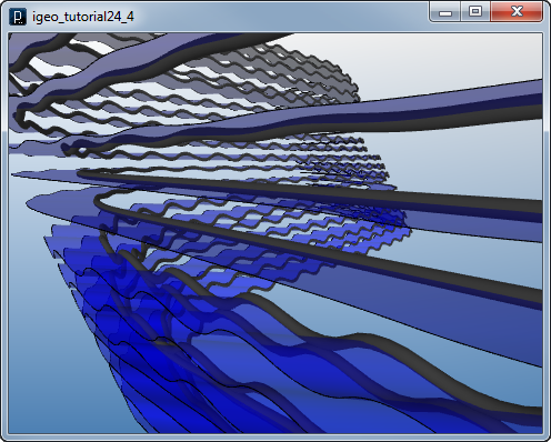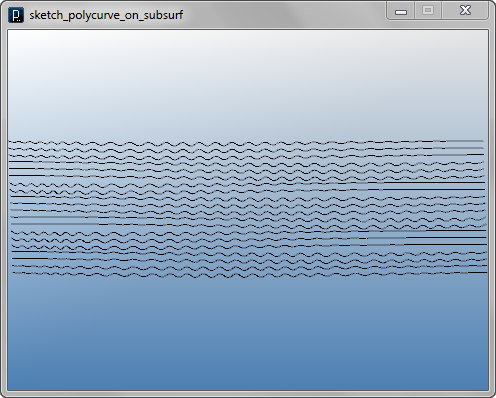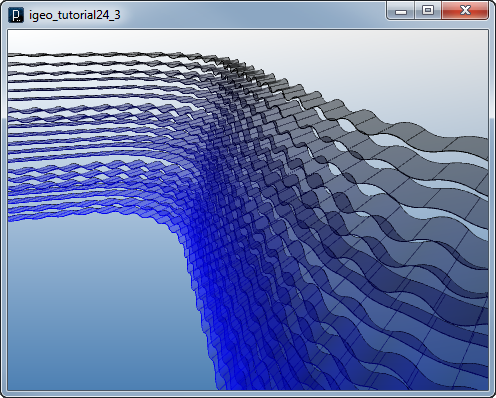 import processing.opengl.*; import igeo.*; size(480, 360, IG.GL); IG.open("surface8.3dm"); ISurface[] surfaces = IG.surfaces(); int unum = 10, vnum = 30; double uinc = 1.0/unum, vinc = 1.0/vnum; for (ISurface surf : surfaces) { for (int i=0; i < unum; i++) { IVec[] pts = new IVec[vnum+1]; for (int j=0; j <= vnum; j++) { if (j%2==0) { pts[j] = surf.pt(i*uinc, j*vinc); } else { pts[j] = surf.pt((i+1)*uinc, j*vinc); } } new ICurve(pts).clr(0); } surf.del(); }