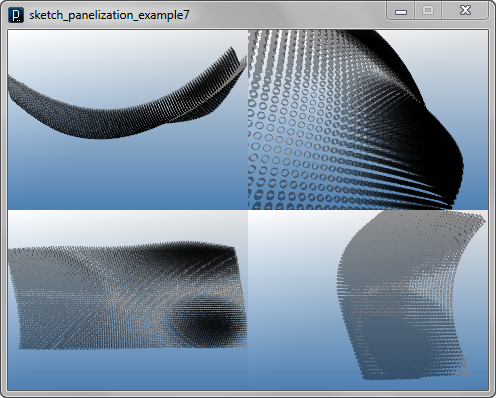 import processing.opengl.*; import igeo.*; size(480, 360, IG.GL); IG.open("surface7.3dm"); ISurface[] surfaces = IG.surfaces(); IImageMap map = new IImageMap("map4.jpg"); for (ISurface surf : surfaces) { int unum = 100, vnum = 50; double uinc = 1.0/unum, vinc = 1.0/vnum; for (int i=0; i < unum; i++) { for (int j=0; j < vnum; j++) { double val = map.get( i*uinc, j*vinc ); IVec pt = surf.pt( i*uinc, j*vinc ); IVec nml = surf.nml( i*uinc, j*vinc ); ICircle cir = new ICircle(pt, nml, 0.1); IG.extrude(cir, val*-2).clr(0); } } surf.del(); }