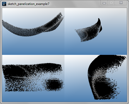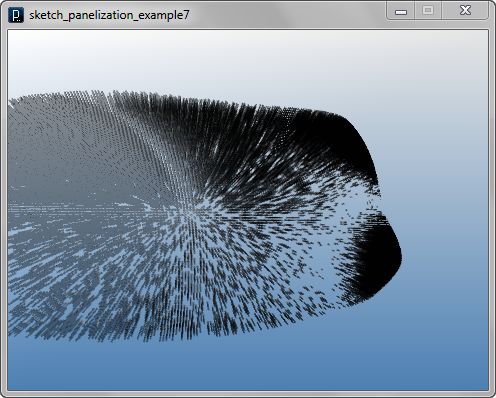import processing.opengl.*; import igeo.*; size(480, 360, IG.GL); IG.open("surface7.3dm"); ISurface[] surfaces = IG.surfaces(); IImageMap map = new IImageMap("map4.jpg"); for (ISurface surf : surfaces) { int unum = 200, vnum = 100; double uinc = 1.0/unum, vinc = 1.0/vnum; for (int i=0; i < unum; i++) { for (int j=0; j < vnum; j++) { double val = map.get( i*uinc, j*vinc ); if (IRandom.percent(val*100)) { IVec pt = surf.pt( i*uinc, j*vinc ); IVec nml = surf.nml( i*uinc, j*vinc ); ICircle cir = new ICircle(pt, nml, 0.05); IG.extrude(cir, -2*val).clr(0); } } } surf.del(); }