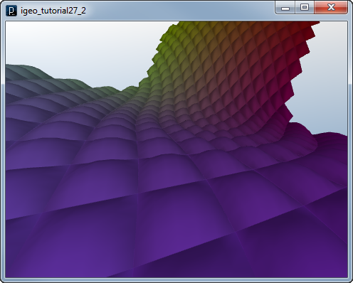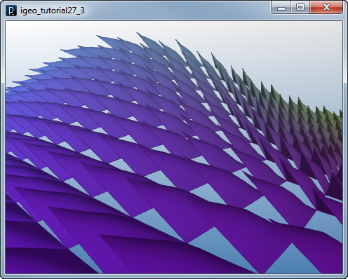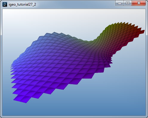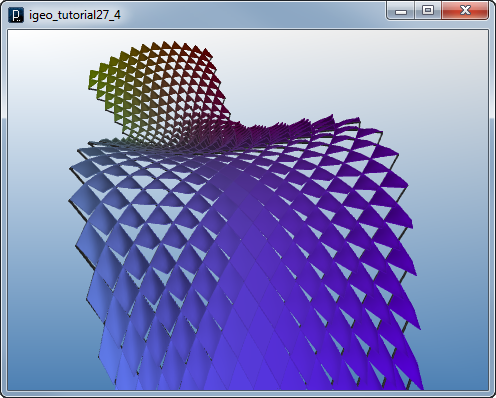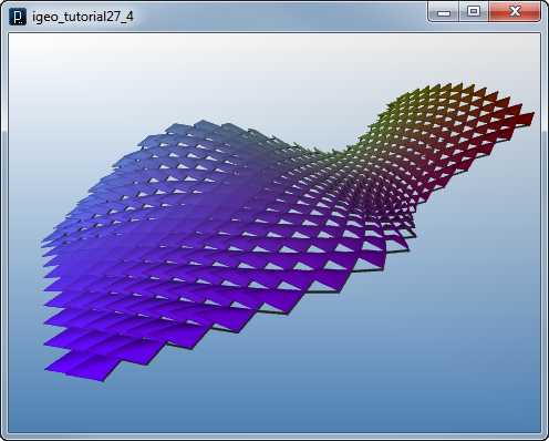add_library('igeo') size(480, 360, IG.GL) IG.open("surface10.3dm") surfaces = IG.surfaces() for surf in surfaces : unum = 36 vnum = 24 uinc = 1.0/unum vinc = 1.0/vnum for i in range(unum) : for j in range(vnum) : if (i+j)%2==0 : pt1 = surf.pt( (i-1)*uinc, j*vinc ) pt2 = surf.pt( i*uinc, (j+1)*vinc ) pt3 = surf.pt( (i+1)*uinc, j*vinc ) pt4 = surf.pt( i*uinc, (j-1)*vinc ) ISurface(pt1,pt2,pt3,pt4).clr(0.3,0.4*j*vinc,i*uinc*0.8) surf.del()