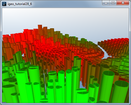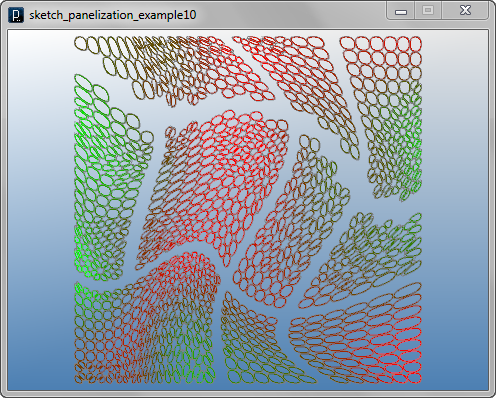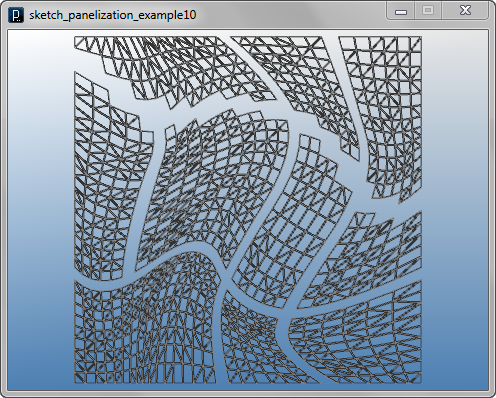 import processing.opengl.*; import igeo.*; size(480, 360, IG.GL); IG.open("surface11.3dm"); ISurface[] surfaces = IG.surfaces(); for (ISurface surf : surfaces) { int unum = 30, vnum = 30; double uinc = 1.0/unum, vinc = 1.0/vnum; double gap = 0.25; for(int i=0; i < unum; i++){ for(int j=0; j < vnum; j++){ IVec pt1 = surf.pt( i*uinc, j*vinc ); IVec pt2 = surf.pt( (i+1-gap)*uinc, j*vinc ); IVec pt3 = surf.pt( (i+1-gap)*uinc, (j+1-gap)*vinc ); IVec pt4 = surf.pt( i*uinc, (j+1-gap)*vinc ); new ISurface(pt1,pt2,pt3,pt4); } } surf.del(); }
