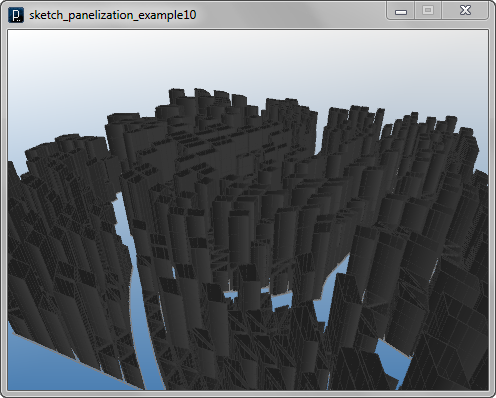 import processing.opengl.*; import igeo.*; size(480, 360, IG.GL); IG.open("surface11.3dm"); ISurface[] surfaces = IG.surfaces(); for (ISurface surf : surfaces) { int unum = 30, vnum = 30; double uinc = 1.0/unum, vinc = 1.0/vnum; double offsetDist = -0.04; int degree = 1; // 1 or 2 for(int i=0; i < unum; i++){ for(int j=0; j < vnum; j++){ IVec pt1 = surf.pt( i*uinc, j*vinc ); IVec pt2 = surf.pt( (i+1)*uinc, j*vinc ); IVec pt3 = surf.pt( (i+1)*uinc, (j+1)*vinc ); IVec pt4 = surf.pt( i*uinc, (j+1)*vinc ); if(IRandom.percent(30)){ // rectangle ICurve crv = new ICurve(new IVec[]{ pt1, pt2, pt3, pt4 }, degree, true); ICurve offCrv = IG.offset(crv, offsetDist); IG.extrude(offCrv, -4).clr(0.2); } else if(IRandom.percent(30)){ // triangles ICurve crv = new ICurve(new IVec[]{ pt1, pt2, pt3 }, degree, true); ICurve offCrv = IG.offset(crv, offsetDist); IG.extrude(offCrv, -2).clr(0.2); ICurve crv2 = new ICurve(new IVec[]{ pt1, pt3, pt4 }, degree, true); ICurve offCrv2 = IG.offset(crv2, offsetDist); IG.extrude(offCrv2, -2).clr(0.2); } else{ // triangles in other direction ICurve crv = new ICurve(new IVec[]{ pt1, pt2, pt4 }, degree, true); ICurve offCrv = IG.offset(crv, offsetDist); IG.extrude(offCrv, -1).clr(0.2); ICurve crv2 = new ICurve(new IVec[]{ pt2, pt3, pt4 }, degree, true); ICurve offCrv2 = IG.offset(crv2, offsetDist); IG.extrude(offCrv2, -1).clr(0.2); } } } surf.del(); }