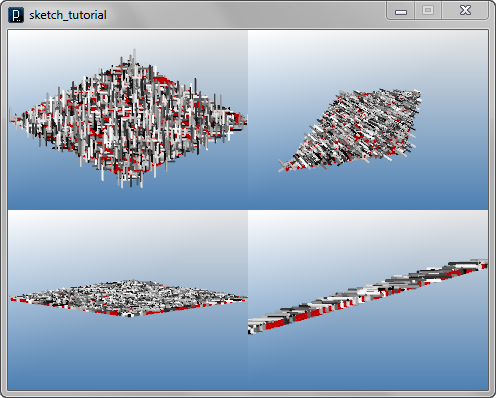 import processing.opengl.*; import igeo.*; void setup(){ size(480, 360, IG.GL); IG.open("surface12.3dm"); ISurface[] surfaces = IG.surfaces(); int unum=40, vnum=40; double uinc=1.0/unum, vinc=1.0/vnum; for(ISurface surf : surfaces){ for(int i=0; i < unum; i++){ for(int j=0; j < vnum; j++){ IVec pt = surf.pt(i*uinc, j*vinc); MyModule module = new MyModule(pt, 1.5); if(IRandom.percent(50)){ IBox box = module.createModule(); box.clr(0.7,0,0); } else{ double armLength = IRandom.get(2,10); IBox[] boxes = module.createModuleWithArm(0.5,armLength); for(IBox bx:boxes){ bx.clr(IRandom.gray()); } } } } surf.del(); } } static class MyModule{ // static fields static double defaultSize = 10.0; // instance fields IVec position; double size; // static methods static IVec randomXShift(IVec pos, double min, double max){ IVec shifted = pos.dup(); shifted.add(IRandom.get(min,max),0,0); return shifted; } static IVec randomYShift(IVec pos, double min, double max){ IVec shifted = pos.dup(); shifted.add(0,IRandom.get(min,max),0); return shifted; } // instance methods MyModule(IVec pos, double sz){ position = pos; size = sz; } MyModule(IVec pos){ position = pos; size = defaultSize; } IBox createModule(){ return new IBox(position, size); } IBox[] createModuleWithArm(double armSize, double armLen){ IBox[] boxes = new IBox[3]; boxes[0] = new IBox(position, size); IVec armPos1 = randomXShift(position, -(armLen-size), 0); armPos1.add(0,0,size); boxes[1] = new IBox(armPos1, armLen, armSize, armSize); IVec armPos2 = randomXShift(armPos1, 0, armLen-size); armPos2 = randomYShift(armPos2, -(armLen-size), 0); armPos2.add(0,0,armSize); boxes[2] = new IBox(armPos2, armSize, armLen, armSize); return boxes; } }