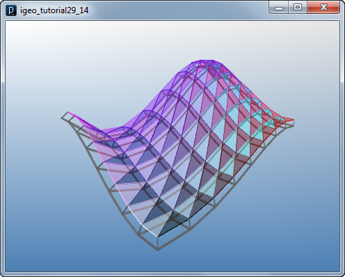 import processing.opengl.*; import igeo.*; size( 480, 360, IG.GL ); IG.open("surface1.3dm"); //input geometry from 3dm file ISurface[] surfs = IG.surfaces(); for( ISurface surf : surfs ){ int unum = 8, vnum = 8; double uinc = 1.0/unum, vinc = 1.0/vnum; for(int i=0; i < unum; i++){ for(int j=0; j < vnum; j++){ IVec pt11 = surf.pt( i*uinc, j*vinc ); IVec pt21 = surf.pt( (i+1)*uinc, j*vinc ); IVec pt12 = surf.pt( i*uinc, (j+1)*vinc ); IVec pt22 = surf.pt( (i+1)*uinc, (j+1)*vinc ); new ISurface(pt11,pt21,pt22).clr(i*uinc,0,j*vinc); new ISurface(pt22,pt12,pt11).clr(1-i*uinc,1-j*vinc,1); double depth = -2; IVec spt11 = surf.pt(i*uinc, j*vinc, depth); IVec spt21 = surf.pt((i+1)*uinc, j*vinc, depth); IVec spt12 = surf.pt(i*uinc, (j+1)*vinc, depth); IVec spt22 = surf.pt((i+1)*uinc, (j+1)*vinc, depth); double frameSize = 0.2; IG.squarePipe(new IVec[]{spt11, spt21, spt22, spt12}, 1, true, frameSize); double radius = 0.1; new ICylinder(pt11,spt11,radius); new ICylinder(pt21,spt21,radius); new ICylinder(pt12,spt12,radius); new ICylinder(pt22,spt22,radius); } } surf.del(); }