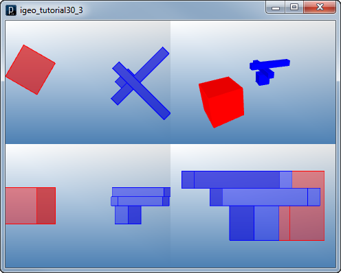 add_library('igeo') def setup() : size(480, 360, IG.GL) module1 = MyRotatedModule(IVec(0,0,0), PI/3, 20) box = module1.createModule() box.clr(1.0,0,0) module2 = MyRotatedModule(IVec(50,0,0), PI/4) boxes = module2.createModuleWithArm(5, 40) for bx in boxes : bx.clr(0,0,1.0) class MyModule : # static fields defaultSize = 10.0 # static methods @staticmethod def randomXShift(pos, min, max) : return pos.dup().add(IRand.get(min,max),0,0) @staticmethod def randomYShift(pos, min, max) : return pos.dup().add(0,IRand.get(min,max),0) # instance methods def __init__(self, pos, sz = defaultSize) : self.position = pos self.size = sz def createModule(self) : return IBox(self.position, self.size) def createModuleWithArm(self, armSize, armLen) : boxes = [] boxes.append(IBox(self.position, self.size)) armPos1 = MyModule.randomXShift(self.position, -(armLen-self.size), 0).add(0,0,self.size) boxes.append(IBox(armPos1, armLen, armSize, armSize)) armPos2 = MyModule.randomXShift(armPos1, 0, armLen-self.size) armPos2 = MyModule.randomYShift(armPos2, -(armLen-self.size), 0).add(0,0,armSize) boxes.append(IBox(armPos2, armSize, armLen, armSize)) return boxes class MyRotatedModule(MyModule) : # static fields rotationAxis = IVec(0,0,1) # instance methods def __init__(self, pos, rotAngle, sz=MyModule.defaultSize) : MyModule.__init__(self, pos, sz) self.rotationAngle = rotAngle def createModule(self) : box = MyModule.createModule(self) box.rot(self.position,self.rotationAxis,self.rotationAngle) return box def createModuleWithArm(self, armSize, armLen) : boxes = MyModule.createModuleWithArm(self, armSize, armLen) for box in boxes : box.rot(self.position, self.rotationAxis, self.rotationAngle) return boxes