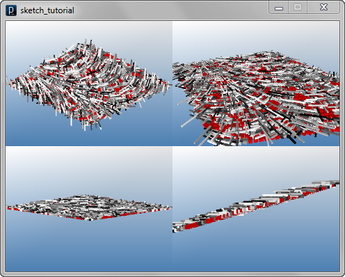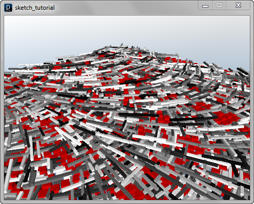 add_library('igeo') def setup() : size(480, 360, IG.GL) IG.open("surface12.3dm") surfaces = IG.surfaces() unum=40 vnum=40 uinc=1.0/unum vinc=1.0/vnum for surf in surfaces : for i in range(unum) : for j in range(vnum) : pt = surf.pt(i*uinc, j*vinc) module = MyRotatedModule(pt, i*uinc*PI, 1.5) if IRand.pct(50) : box = module.createModule() box.clr(0.7,0,0) else : armLength = IRand.get(2,10) boxes = module.createModuleWithArm(0.5,armLength) for bx in boxes : bx.clr(IRand.gray()) surf.del() class MyModule : # static fields defaultSize = 10.0 # static methods @staticmethod def randomXShift(pos, min, max) : return pos.dup().add(IRand.get(min,max),0,0) @staticmethod def randomYShift(pos, min, max) : return pos.dup().add(0,IRand.get(min,max),0) # instance methods def __init__(self, pos, sz = defaultSize) : self.position = pos self.size = sz def createModule(self) : return IBox(self.position, self.size) def createModuleWithArm(self, armSize, armLen) : boxes = [] boxes.append(IBox(self.position, self.size)) armPos1 = MyModule.randomXShift(self.position, -(armLen-self.size), 0).add(0,0,self.size) boxes.append(IBox(armPos1, armLen, armSize, armSize)) armPos2 = MyModule.randomXShift(armPos1, 0, armLen-self.size) armPos2 = MyModule.randomYShift(armPos2, -(armLen-self.size), 0).add(0,0,armSize) boxes.append(IBox(armPos2, armSize, armLen, armSize)) return boxes class MyRotatedModule(MyModule) : # static fields rotationAxis = IVec(0,0,1) # instance methods def __init__(self, pos, rotAngle, sz=MyModule.defaultSize) : MyModule.__init__(self, pos, sz) self.rotationAngle = rotAngle def createModule(self) : box = MyModule.createModule(self) box.rot(self.position,self.rotationAxis,self.rotationAngle) return box def createModuleWithArm(self, armSize, armLen) : boxes = MyModule.createModuleWithArm(self, armSize, armLen) for box in boxes : box.rot(self.position, self.rotationAxis, self.rotationAngle) return boxes