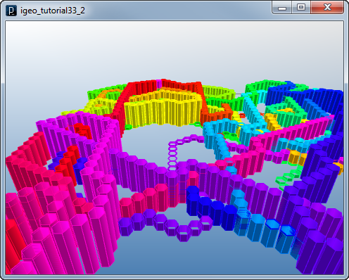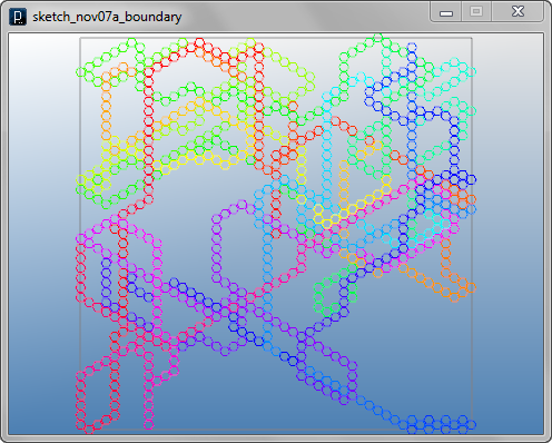 add_library('igeo') def setup() : size(480, 360, IG.GL) IG.duration(1000) MyBoundary(-200,-200,200,200) MyHexAgent(IVec(0,0,0), IVec(0,10,0)) class MyBoundary(IAgent) : def __init__(self, x1, y1, x2, y2) : self.minx = x1 self.miny = y1 self.maxx = x2 self.maxy = y2 IG.rect(IVec(x1,y1,0), x2-x1, y2-y1) class MyHexAgent(IAgent) : def __init__(self, p, d) : self.pos = p self.dir = d self.depth = 0 self.depthInc = 0.5 self.hue = 0 def interact(self, agents) : for agent in agents : if isinstance(agent, MyBoundary) : #checking if next position is out of the boundary nextPos = self.pos.cp(self.dir) if nextPos.x() < agent.minx : self.dir.ref(IG.xaxis) #reflect on x-plane elif nextPos.x() > agent.maxx : self.dir.ref(IG.xaxis) #reflect on x-plane if nextPos.y() < agent.miny : self.dir.ref(IG.yaxis) #reflect on y-plane elif nextPos.y() > agent.maxy : self.dir.ref(IG.yaxis) #reflect on y-plane def update(self) : self.createHexGeometry() self.pos.add(self.dir) #random shift of direction if IRand.pct(10) : self.dir.rot(PI/3) elif IRand.pct(10) : self.dir.rot(-PI/3) #random shift of height if IRand.pct(10) : self.depthInc *= -1 self.depth += self.depthInc self.hue += 0.002 def createHexGeometry(self) : #creating hexagonal extrusion cpts = [] for i in range(6) : cpts.append(self.dir.dup().rot(PI/3*i+PI/6).div(2).add(self.pos)) IG.extrude(cpts, 1, True, self.depth).hsb(self.hue,1,1)