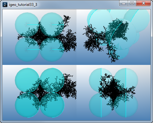 add_library('igeo') def setup() : size(480, 360, IG.GL) IG.duration(150) LineAgent(IVec(0,0,0), IVec(1,0,0)) for i in range(-1,2,2) : # -1, 1 for j in range(-1,2,2) : for k in range(-1,2,2) : LineBlockAgent(IVec(40*i,40*j,40*k), 40) class LineBlockAgent(IAgent) : def __init__(self, p, rad) : self.pos = p self.radius = rad def interact(self, agents) : for agent in agents : if isinstance(agent, LineAgent) : if agent.pt2.dist(self.pos) < self.radius : agent.del() def update(self) : if self.time()==0 : ISphere(self.pos,self.radius).clr(0,1,1,0.2) class LineAgent(IAgent) : length = 2 clearance = 1.99 #less than length def __init__(self, pt, dir) : self.pt1 = pt self.pt2 = pt.dup().add(dir.dup().len(LineAgent.length)) self.isColliding = False def interact(self, agents) : for agent in agents : if self.time() == 0 : #only in the first time if isinstance(agent, LineAgent) : if agent is not self : # checking clearance of end point if agent.pt2.dist(self.pt2) < LineAgent.clearance : self.isColliding = True def update(self) : if self.isColliding : self.del() elif self.time() == 0 : #if not colliding ICurve(self.pt1,self.pt2).clr(0) dir = self.pt2.dif(self.pt1) #rotation axis with random direction axis = IRand.pt(-1,1).len(1) if IRand.pct(50) : #bend LineAgent(self.pt2, dir.dup().rot(axis,IRand.get(PI/3,PI/3*2))) if IRand.pct(50) : #bend the other way LineAgent(self.pt2, dir.dup().rot(axis,-IRand.get(PI/3,PI/3*2))) if IRand.pct(90) : #straight LineAgent(self.pt2, dir.dup())