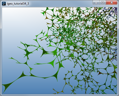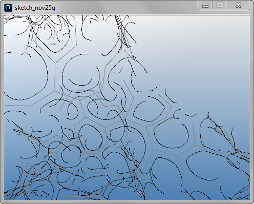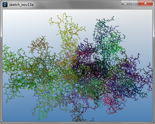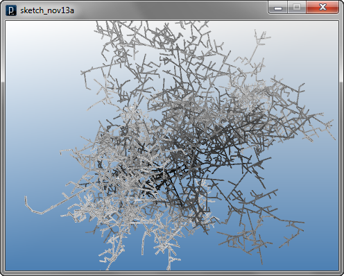 add_library('igeo') def setup() : size(480, 360, IG.GL) IRand.init(8) IG.duration(120) LineAgent(IVec(0,0,0), IVec(1,0,0)).clr(0) IG.fill() class LineAgent(IAgent) : length = 2 clearance = 1.99 #less than length def __init__(self, pt, dir) : self.pt1 = pt self.pt2 = pt.dup().add(dir.dup().len(LineAgent.length)) self.isColliding = False def interact(self, agents) : if self.time() == 0 : #only in the first time for agent in agents : if isinstance(agent, LineAgent) : if agent is not self : #checking clearance of end point if agent.pt2.dist(self.pt2) < LineAgent.clearance : self.isColliding = True def update(self) : if self.isColliding : self.del() elif self.time() == 0 : #if not colliding dir = self.pt2.dif(self.pt1) axis = IRand.pt(-1,1).len(1) nextDir1 = dir.dup().rot(axis,PI/3) nextDir2 = dir.dup().rot(axis,-PI/3) #degree 2 surface with 3x3 control points cpts = [] cpts.append([]) cpts.append([]) cpts.append([]) cpts[0].append(self.pt1.mid(self.pt2)) cpts[0].append(self.pt1.mid(self.pt2)) cpts[0].append(self.pt1.mid(self.pt2)) cpts[1].append(self.pt2) cpts[1].append(self.pt2) cpts[1].append(self.pt2) cpts[2].append(self.pt2.mid(self.pt2.cp(nextDir1))) cpts[2].append(self.pt2) cpts[2].append(self.pt2.mid(self.pt2.cp(nextDir2))) ISurface(cpts, 2, 2).clr(self.clr()) r = self.clr().getRed() + IRand.getInt(-10, 10) g = self.clr().getGreen() + IRand.getInt(-10, 10) b = self.clr().getBlue() + IRand.getInt(-10, 10) if IRand.pct(80) : #bend LineAgent(self.pt2, nextDir1).clr(r,g,b) if IRand.pct(50) : #bend the other way LineAgent(self.pt2, nextDir2).clr(r,g,b)