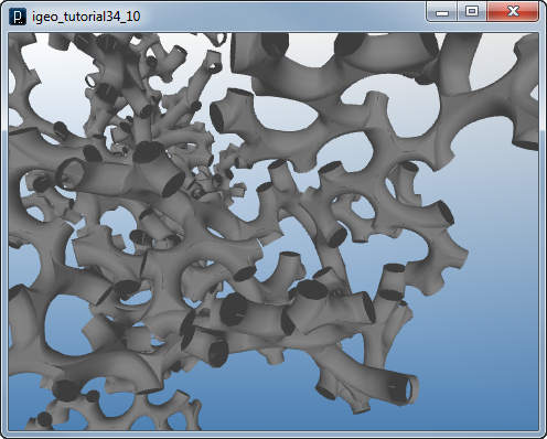 add_library('igeo') def setup() : size(480, 360, IG.GL) IRand.init(3) IG.duration(30) #second and third vector needs to be perpendicular LineAgent(IVec(0,0,0),IVec(1,0,0),IVec(0,0,1)).clr(0) IG.fill() class LineAgent(IAgent) : length = 2 clearance = 1.99 #less than length def __init__(self, pt, dir, ax) : self.pt1 = pt self.pt2 = pt.dup().add(dir.dup().len(LineAgent.length)) self.axis = ax self.isColliding = False def interact(self, agents) : if self.time() == 0 : #only in the first time for agent in agents : if isinstance(agent, LineAgent) : if agent is not self : #checking clearance of end point if agent.pt2.dist(self.pt2) < LineAgent.clearance : self.isColliding = True def update(self) : if self.isColliding : self.del() elif self.time() == 0 : #if not colliding ICurve(self.pt1,self.pt2) # center line dir = self.pt2.dif(self.pt1) # child dir & points nextDir1 = dir.dup().rot(self.axis, IRand.get(PI/4,PI/3)) nextDir2 = dir.dup().rot(self.axis,-IRand.get(PI/4,PI/3)) nextPt1 = self.pt2.cp(nextDir1) nextPt2 = self.pt2.cp(nextDir2) #midpoints mid1 = self.pt1.mid(self.pt2) mid2 = self.pt2.mid(nextPt1) mid3 = self.pt2.mid(nextPt2) #mid of midpoints quarter1 = self.pt2.mid(mid1) quarter2 = self.pt2.mid(mid2) quarter3 = self.pt2.mid(mid3) #axis of child agents nextAxis1 = self.axis.dup().rot(nextDir1, IRand.get(-PI/4,PI/4)) nextAxis2 = self.axis.dup().rot(nextDir2, IRand.get(-PI/4,PI/4)) offsetWidth = -0.5 offset1 = dir.cross(self.axis).len(offsetWidth) offset2 = nextDir1.cross(nextAxis1).len(offsetWidth) offset3 = nextDir2.cross(nextAxis2).len(offsetWidth) depth = 0.5 depthVec1 = self.axis.dup().len(depth) depthVec2 = nextAxis1.dup().len(depth) depthVec3 = nextAxis2.dup().len(depth) self.createEdgeSurface(mid1,quarter1,quarter2,mid2, \ offset1,offset2,depthVec1,depthVec2) self.createEdgeSurface(mid2,quarter2,quarter3,mid3, \ offset2.dup().flip(),offset3,depthVec2,depthVec3) self.createEdgeSurface(mid3,quarter3,quarter1,mid1, \ offset3.dup().flip(),offset1.dup().flip(),depthVec3,depthVec1) self.createCapSurface(mid1,quarter1,mid2,quarter2,mid3,quarter3, \ depthVec1,depthVec2,depthVec3) self.createCapSurface(mid1,quarter1,mid3,quarter3,mid2,quarter2, \ depthVec1.flip(),depthVec3.flip(),depthVec2.flip()) if IRand.pct(80) : #bend LineAgent(self.pt2, nextDir1, nextAxis1) if IRand.pct(50) : #bend the other way LineAgent(self.pt2, nextDir2, nextAxis2) def createEdgeSurface(self,pt1,pt2,pt3,pt4,offsetDir1,\ offsetDir2,extrudeDir1,extrudeDir2) : cpts = [] cpts.append([]) cpts.append([]) cpts.append([]) cpts.append([]) cpts[0].append(pt1.dup().add(extrudeDir1)) cpts[0].append(pt1.dup().add(offsetDir1).add(extrudeDir1)) cpts[0].append(pt1.dup().add(offsetDir1).sub(extrudeDir1)) cpts[0].append(pt1.dup().sub(extrudeDir1)) cpts[1].append(pt2.dup().add(extrudeDir1)) cpts[1].append(pt2.dup().add(offsetDir1).add(extrudeDir1)) cpts[1].append(pt2.dup().add(offsetDir1).sub(extrudeDir1)) cpts[1].append(pt2.dup().sub(extrudeDir1)) cpts[2].append(pt3.dup().add(extrudeDir2)) cpts[2].append(pt3.dup().add(offsetDir2).add(extrudeDir2)) cpts[2].append(pt3.dup().add(offsetDir2).sub(extrudeDir2)) cpts[2].append(pt3.dup().sub(extrudeDir2)) cpts[3].append(pt4.dup().add(extrudeDir2)) cpts[3].append(pt4.dup().add(offsetDir2).add(extrudeDir2)) cpts[3].append(pt4.dup().add(offsetDir2).sub(extrudeDir2)) cpts[3].append(pt4.dup().sub(extrudeDir2)) return ISurface(cpts, 3, 1) def createCapSurface(self,pt1,pt2,pt3,pt4,pt5,pt6,\ shiftDir1,shiftDir2,shiftDir3) : cpts = [] cpts.append([]) cpts.append([]) cpts.append([]) cpts.append([]) cpts[0].append(pt1.dup().add(shiftDir1)) cpts[0].append(pt2.dup().add(shiftDir1)) cpts[0].append(pt4.dup().add(shiftDir2)) cpts[0].append(pt3.dup().add(shiftDir2)) cpts[1].append(pt1.dup().add(shiftDir1)) cpts[1].append(pt2.dup().add(shiftDir1)) cpts[1].append(pt4.mid(pt6).add(shiftDir2.mid(shiftDir3))) cpts[1].append(pt4.dup().add(shiftDir2)) cpts[2].append(pt1.dup().add(shiftDir1)) cpts[2].append(pt2.dup().add(shiftDir1)) cpts[2].append(pt4.mid(pt6).add(shiftDir2.mid(shiftDir3))) cpts[2].append(pt6.dup().add(shiftDir3)) cpts[3].append(pt1.dup().add(shiftDir1)) cpts[3].append(pt2.dup().add(shiftDir1)) cpts[3].append(pt6.dup().add(shiftDir3)) cpts[3].append(pt5.dup().add(shiftDir3)) return ISurface(cpts, 3, 3)