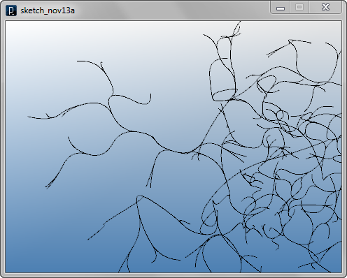 add_library('igeo') def setup() : size(480, 360, IG.GL) IG.duration(100) LineAgent(IVec(0,0,0), IVec(1,0,0)).clr(0) class LineAgent(IAgent) : length = 2 clearance = 1.99 #less than length def __init__(self, pt, dir) : self.pt1 = pt self.pt2 = pt.dup().add(dir.dup().len(LineAgent.length)) self.isColliding = False def interact(self, agents) : if self.time() == 0 : #only in the first time for agent in agents : if isinstance(agent, LineAgent) : if agent is not self : # checking clearance of end point if agent.pt2.dist(self.pt2) < LineAgent.clearance : self.isColliding=True def update(self) : if self.isColliding : self.del() elif self.time() == 0 : #if not colliding dir = self.pt2.dif(self.pt1) axis = IRand.pt(-1,1).len(1) if IRand.pct(100) : #bend nextDir1 = dir.dup().rot(axis,IRand.get(PI/3,PI/3*2)) #degree 2 curve at midpoint of pt1&pt2, pt2, and midpoint of pt2 and next agent's point ICurve([ self.pt1.mid(self.pt2),self.pt2, \ self.pt2.mid(self.pt2.cp(nextDir1)) ], 2).clr(self.clr()) LineAgent(self.pt2, nextDir1).clr(self.clr()) if IRand.pct(50) : #bend the other way #degree 2 curve at midpoint of pt1&pt2, pt2, and midpoint of pt2 and next agent's point nextDir2 = dir.dup().rot(axis,-IRand.get(PI/3,PI/3*2)) ICurve([ self.pt1.mid(self.pt2),self.pt2, \ self.pt2.mid(self.pt2.cp(nextDir2)) ],2).clr(self.clr()) LineAgent(self.pt2, nextDir2).clr(self.clr())