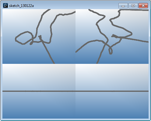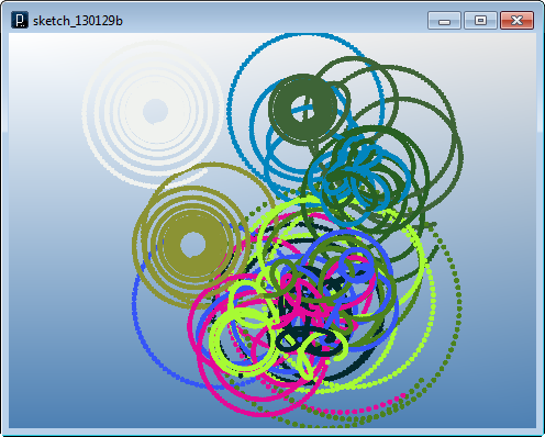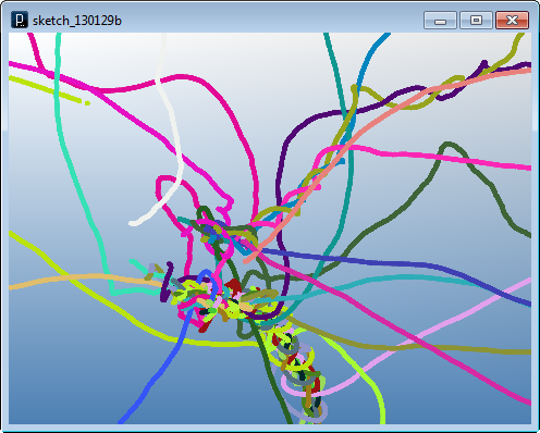 import processing.opengl.*; import igeo.*; void setup(){ size(480, 360, IG.GL); for(int i=0; i < 30; i++){ new MyParticle(IRand.pt(0,0,100,100), IG.v(10,0,0)).clr(IRand.clr()); } } class MyParticle extends IParticle{ MyParticle(IVec p, IVec v){ super(p,v); } void interact(ArrayList < IDynamics > agents){ for(int i=0; i < agents.size(); i++){ if(agents.get(i) instanceof MyParticle){ MyParticle p = (MyParticle)agents.get(i); if(p != this){ if(p.dist(this) < 20){ IVec force = p.pos().dif(pos()); force.mul(2.0); push(force); } } } } } void update(){ IVec force = IRand.pt(-100,-100,0,100,100,0); push(force); new IPoint(pos().cp()).clr(clr()); } }