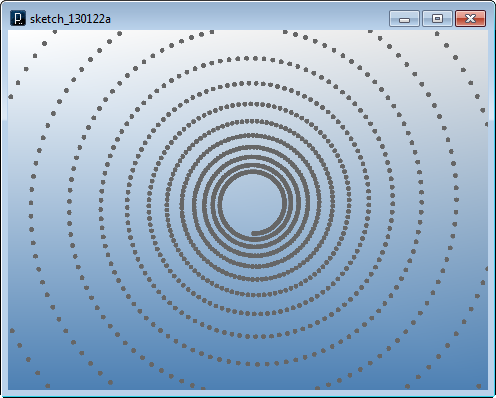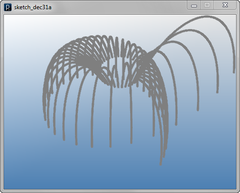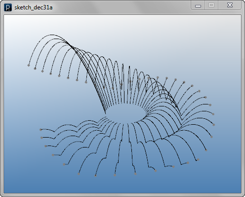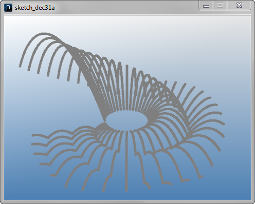import processing.opengl.*; import igeo.*; void setup(){ size(480, 360, IG.GL); IG.duration(200); int num = 40; for(int i=0; i < num; i++){ double a = i*2*PI/num; new MyParticle(IG.v(20,0,0).rot(a),IG.v(10,0,i).rot(a)); } new MyGravity(IG.v(0,0,-10)); } class MyParticle extends IParticle{ MyParticle(IVec p, IVec v){ super(p,v); } void update(){ new IPoint(pos().cp()); } } class MyGravity extends IAgent{ IVec gravity; MyGravity(IVec g){ gravity=g; } void interact(IDynamics agent){ if(agent instanceof MyParticle){ MyParticle particle = (MyParticle)agent; particle.push(gravity); } } }