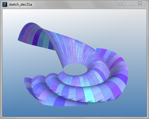 import processing.opengl.*; import igeo.*; void setup(){ size(480, 360, IG.GL); IG.duration(200); int num = 40; MyParticle[] particle = new MyParticle[num]; for(int i=0; i < num; i++){ double a = i*2*PI/num; particle[i] = new MyParticle(IG.v(20,0,0).rot(a), IG.v(10,0,i).rot(a)); } for(int i=1; i < num; i++){ new GeometryAgent(particle[i-1], particle[i]); } new MyGravity(IG.v(0,0,-10)); new BouncePlane(-5); } class MyParticle extends IParticle{ IVec prevPos; MyParticle(IVec p, IVec v){ super(p,v); hide(); // hiding the point of IParticle } void update(){ IVec curPos = pos().cp(); if(prevPos != null){ new ICurve(prevPos, curPos); } prevPos = curPos; } } class MyGravity extends IAgent{ IVec gravity; MyGravity(IVec g){ gravity=g; } void interact(IDynamics agent){ if(agent instanceof MyParticle){ MyParticle particle = (MyParticle)agent; particle.push(gravity); } } } class BouncePlane extends IAgent{ double z; BouncePlane(double zval){ z=zval; } void interact(IDynamics agent){ if(agent instanceof MyParticle){ MyParticle particle = (MyParticle)agent; if(particle.pos().z() < z){ particle.pos().add(0,0,z - particle.pos().z()); particle.vel().ref(IG.zaxis); } } } } class GeometryAgent extends IAgent{ MyParticle particle1, particle2; IVec prevPos1, prevPos2; GeometryAgent(MyParticle p1, MyParticle p2){ particle1 = p1; particle2 = p2; } void update(){ IVec curPos1 = particle1.pos().cp(); IVec curPos2 = particle2.pos().cp(); if(prevPos1 != null && prevPos2 != null){ new ISurface(prevPos1, curPos1, curPos2, prevPos2).clr(clr()); } prevPos1 = curPos1; prevPos2 = curPos2; // update color double r = red() + IRand.get(-0.01,0.01); double g = green() + IRand.get(-0.02,0.02); clr(r, g, 1.0); } }