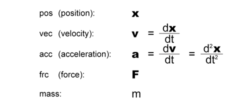 To implement a particle with motion behavior following Newton's laws, you'd start with putting fields of a position, a velocity, an acceleration, a force and a mass in an agent class. The type of variable of mass is scalar (double) and others are vectors (IVec). Because a mass of an object usually doesn't change, the variable of a mass can be seen as a constant value and is initialized at the declaration of the variable. Usually in simulation of motion, an object is initialized with an initial position and velocity, and the constructor of the class takes two input vectors to initialize the instance's position and velocity.