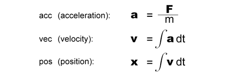 To update an object's acceleration, velocity and position, you only need to use the resultant force vector, not each individual force vector, because the equations in Newton's laws are all linear-independent. According to the Newton's laws and the definition of an acceleration and a velocity, the agent's acceleration, velocity and position can be calculated as the following.
