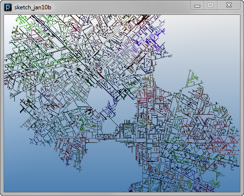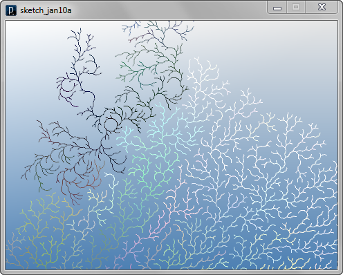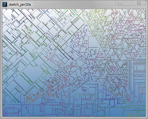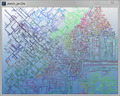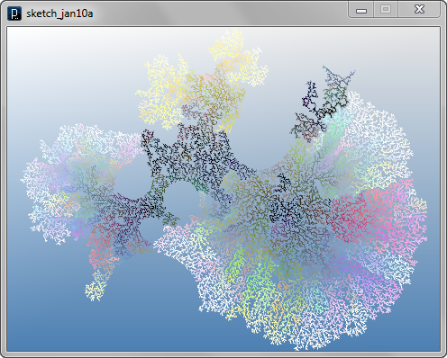 import processing.opengl.*; import igeo.*; void setup(){ size(480,360,IG.GL); IG.duration(150); new LineAgent(IG.v(0,0,0), IG.v(1,0,0), PI/3, 20, 30, 100).clr(0.3); new LineAgent(IG.v(100,0,0), IG.v(-1,0,0), PI/2, 20, 0, 100).clr(0.3); new LineAgent(IG.v(-20,50,0), IG.v(0,-1,0), PI/2, 10, 0, 100).clr(0.3); new LineAgent(IG.v(0,-100,0), IG.v(0,1,0), PI/2, 10, 10, 100).clr(0.3); new LineAgent(IG.v(-40,0,0), IG.v(1,0,0), PI*0.4, 20, 30, 100).clr(0.3); new LineAgent(IG.v(-100,40,0), IG.v(1,1,0), PI/2, 10, 10, 100).clr(0.3); } static class LineAgent extends IAgent{ static final double length = 2; static final double clearance = 1.99; //less than lengthn IVec pt1, pt2; boolean isColliding=false; double angle; double pct1, pct2, pct3; LineAgent(IVec pt, IVec dir, double ang, double percent1,double percent2,double percent3){ pt1 = pt; pt2 = pt.dup().add(dir.dup().len(length)); angle = ang; pct1 = percent1; pct2 = percent2; pct3 = percent3; } void interact(ArrayList < IDynamics > agents){ if(time == 0){ //only in the first time for(int i=0; i < agents.size() && !isColliding; i++){ if(agents.get(i) instanceof LineAgent){ LineAgent lineAgent = (LineAgent)agents.get(i); if(lineAgent != this){ //agents include "this" // checking clearance of end point if(lineAgent.pt2.dist(pt2) < clearance){ isColliding=true; } } } } } } void update(){ if(isColliding){ del(); } else if(time == 0){ //if not colliding new ICurve(pt1,pt2).clr(clr()); IVec dir = pt2.dif(pt1); double r = red()+IRand.get(-0.03,0.03); double g = green()+IRand.get(-0.03,0.03); double b = blue()+IRand.get(-0.03,0.03); if(IRand.pct(pct1)){ //bend new LineAgent(pt2,dir.cp().rot(angle),angle,pct1,pct2,pct3).clr(r,g,b); } if(IRand.pct(pct2)){ //bend the other way new LineAgent(pt2,dir.cp().rot(-angle),angle,pct1,pct2,pct3).clr(r,g,b); } if(IRand.pct(pct3)){ //straight new LineAgent(pt2,dir.cp(),angle,pct1,pct2,pct3).clr(r,g,b); } } } }