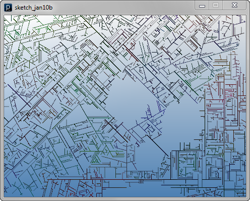 import processing.opengl.*; import igeo.*; void setup(){ size(480,360,IG.GL); IG.duration(150); new LineAgent(IG.v(100,-50,0), IG.v(0,1,0), PI/2, 20,10,99).clr(0); new LineAgent(IG.v(-50,150,0), IG.v(1,1,0), PI/2, 20,10,99).clr(0); new BlockAgent(IG.v(0,0,0), 20); new BlockAgent(IG.v(-30,80,0), 30); new BlockAgent(IG.v(50,50,0), 30); new BlockAgent(IG.v(180,150,0), 50); new BlockAgent(IG.v(0,-120,0), 80); } static class BlockAgent extends IAgent{ IVec pt; double radius; BlockAgent(IVec p, double r){ pt = p; radius = r; } boolean isColliding(LineAgent agent){ if(agent.pt2.dist(pt) < radius){ return true; } return false; } } static class LineAgent extends IAgent{ static final double length = 2; static final double clearance = 1.99; //less than length IVec pt1, pt2; boolean isColliding=false; double angle; double pct1, pct2, pct3; LineAgent(IVec pt, IVec dir, double ang, double percent1,double percent2,double percent3){ pt1 = pt; pt2 = pt.dup().add(dir.dup().len(length)); angle = ang; pct1 = percent1; pct2 = percent2; pct3 = percent3; } void interact(ArrayList < IDynamics > agents){ if(time == 0){ //only in the first time for(int i=0; i < agents.size() && !isColliding; i++){ if(agents.get(i) instanceof LineAgent){ LineAgent lineAgent = (LineAgent)agents.get(i); if(lineAgent != this){ //agents include "this" // checking clearance of end point if(lineAgent.pt2.dist(pt2) < clearance){ isColliding=true; } } } else if(agents.get(i) instanceof BlockAgent){ BlockAgent b = (BlockAgent)agents.get(i); if(b.isColliding(this)){ if(IRand.pct(80)){ //ignores block agent in 20% isColliding=true; } } } } } } void update(){ if(isColliding){ del(); } else if(time == 0){ //if not colliding new ICurve(pt1,pt2).clr(clr()); IVec dir = pt2.dif(pt1); if(IRand.pct(2)){ //change angle occasionally if(IRand.pct(50)){ angle+=PI/12; } else{ angle -= PI/12; } } double r = red()+IRand.get(-0.03,0.03); double g = green()+IRand.get(-0.03,0.03); double b = blue()+IRand.get(-0.03,0.03); if(IRand.pct(pct1)){ //bend new LineAgent(pt2,dir.cp().rot(angle),angle,pct1,pct2,pct3).clr(r,g,b); } if(IRand.pct(pct2)){ //bend the other way new LineAgent(pt2,dir.cp().rot(-angle),angle,pct1,pct2,pct3).clr(r,g,b); } if(IRand.pct(pct3)){ //straight new LineAgent(pt2,dir.cp(),angle,pct1,pct2,pct3).clr(r,g,b); } } } }