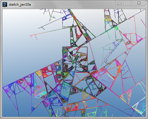 add_library('igeo') def setup() : size(480,360,IG.GL) IRand.init(2) IG.duration(700) LineAgent(IG.v(-0.1,0,0),IG.v(1,0,0),0,0).clr(0) LineAgent(IG.v(500,-0.1,0),IG.v(0,1,0),0,0).clr(0) LineAgent(IG.v(500+0.1,500,0),IG.v(-1,0,0),0,0).clr(0) LineAgent(IG.v(0,500+0.1,0),IG.v(0,-1,0),0,0).clr(0) LineAgent(IG.v(500/2,0,0),IG.v(1,0,0),0,0).clr(0) LineAgent(IG.v(500,500/2,0),IG.v(0,1,0),0,0).clr(0) LineAgent(IG.v(500/2,500,0),IG.v(-1,0,0),0,0).clr(0) LineAgent(IG.v(0,500/2,0),IG.v(0,-1,0),0,0).clr(0) for i in range(30) : LineAgent(IRand.pt(100,100,0,400,400,0),IRand.pt(-10,-10,0,10,10,0),0,0).clr(IRand.clr(0.4,0.4,0.4)) class LineAgent(IAgent) : # static variable constants length = 2 clearance = 1.99 #less than length angleThreshold = PI/20 threshold = 10 bendSize = 2 def __init__(self, pt, dir, bend, bcount) : self.pt1 = pt self.pt2 = pt.cp(dir.cp().len(LineAgent.length)) self.isColliding = False self.minDist = 0 self.frontAngle = 0 self.bendAngle = bend self.bendCount = bcount def interact(self, agents) : if self.time() == 0 : #only in the first time self.minDist = -1 #reset for agent in agents : if self.isColliding : return if isinstance(agent, LineAgent) and agent is not self : # checking clearance of end point dist = agent.pt2.dist(self.pt2) if dist < LineAgent.clearance : self.isColliding=True elif dist < LineAgent.threshold : #not colliding but close #check if not the parent and in front and closest one if not self.pt1.eq(agent.pt2) and \ self.pt2.dif(self.pt1).angle(agent.pt2.dif(self.pt1)) < LineAgent.angleThreshold and \ (self.minDist < 0 or dist < self.minDist) : self.minDist = dist self.frontAngle = self.pt2.dif(self.pt1).angle(agent.pt2.dif(agent.pt1),IG.zaxis) def update(self) : if self.time() == 0 : if self.isColliding : self.del() else : #if not colliding ICurve(self.pt1,self.pt2).clr(self.clr()) dir = self.pt2.dif(self.pt1) if IRand.pct(1) : #branching r = self.red()+IRand.get(-0.1,0.1) g = self.green()+IRand.get(-0.1,0.1) b = self.blue()+IRand.get(-0.1,0.1) LineAgent(self.pt2,dir.cp().rot(IRand.get(PI/3,2*PI/3)),0,0).clr(r,g,b) r = self.red()+IRand.get(-0.03,0.03) g = self.green()+IRand.get(-0.03,0.03) b = self.blue()+IRand.get(-0.03,0.03) #checking bend if self.bendCount == 0 and self.minDist >=0 and self.frontAngle!=0 : if self.frontAngle < 0 : self.frontAngle+=PI #going in only one direction self.bendCount = LineAgent.bendSize self.bendAngle = self.frontAngle/self.bendCount if self.bendCount > 0 : #bending dir.rot(self.bendAngle) LineAgent(self.pt2, dir, self.bendAngle, self.bendCount-1).clr(r,g,b) else : #go straight LineAgent(self.pt2, dir, 0, 0).clr(r,g,b)