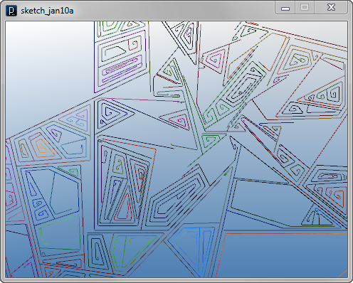 add_library('igeo') def setup() : size(480,360,IG.GL) IRand.init(3) IG.duration(700) LineAgent(IG.v(-0.1,0,0), IG.v(1,0,0)).clr(0) LineAgent(IG.v(500,-0.1,0), IG.v(0,1,0)).clr(0) LineAgent(IG.v(500+0.1,500,0), IG.v(-1,0,0)).clr(0) LineAgent(IG.v(0,500+0.1,0), IG.v(0,-1,0)).clr(0) for i in range(10) : LineAgent(IRand.pt(100,100,0,400,400,0), IRand.pt(-10,-10,0,10,10,0)).clr(IRand.clr(0.4,0.4,0.4)) class LineAgent(IAgent) : # static variable constants length = 2 clearance = 1.99 #less than length angleThreshold = PI/20 threshold = 10 def __init__(self, pt, dir) : self.pt1 = pt self.pt2 = pt.cp(dir.cp().len(LineAgent.length)) self.isColliding = False self.angle = 0 self.minDist = 0 self.frontAngle = 0 def interact(self, agents) : if self.time() == 0 : #only in the first time self.minDist = -1 #reset for agent in agents : if self.isColliding : return if isinstance(agent, LineAgent) and agent is not self : # checking clearance of end point dist = agent.pt2.dist(self.pt2) if dist < LineAgent.clearance : self.isColliding=True elif dist < LineAgent.threshold : #not colliding but close #check if not the parent and in front and closest one if not self.pt1.eq(agent.pt2) and \ self.pt2.dif(self.pt1).angle(agent.pt2.dif(self.pt1)) < LineAgent.angleThreshold and \ (self.minDist < 0 or dist < self.minDist) : self.minDist = dist self.frontAngle = self.pt2.dif(self.pt1).angle(agent.pt2.dif(agent.pt1),IG.zaxis) def update(self) : if self.time() == 0 : if self.isColliding : self.del() else : #if not colliding ICurve(self.pt1,self.pt2).clr(self.clr()) dir = self.pt2.dif(self.pt1) if IRand.pct(1) : #branching r = self.red()+IRand.get(-0.1,0.1) g = self.green()+IRand.get(-0.1,0.1) b = self.blue()+IRand.get(-0.1,0.1) LineAgent(self.pt2, dir.cp().rot(IRand.get(PI/3,2*PI/3))).clr(r,g,b) if self.frontAngle < 0 : self.frontAngle+=PI #going in only one direction r = self.red()+IRand.get(-0.03,0.03) g = self.green()+IRand.get(-0.03,0.03) b = self.blue()+IRand.get(-0.03,0.03) LineAgent(self.pt2, dir.rot(self.frontAngle)).clr(r,g,b)