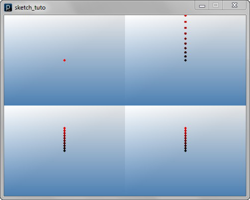 import processing.opengl.*; import igeo.*; size( 480, 360, IG.GL ); for( int i=0; i < 10; i++){ new IPoint(0, 0, i*5).clr(i*0.1,0,0); }